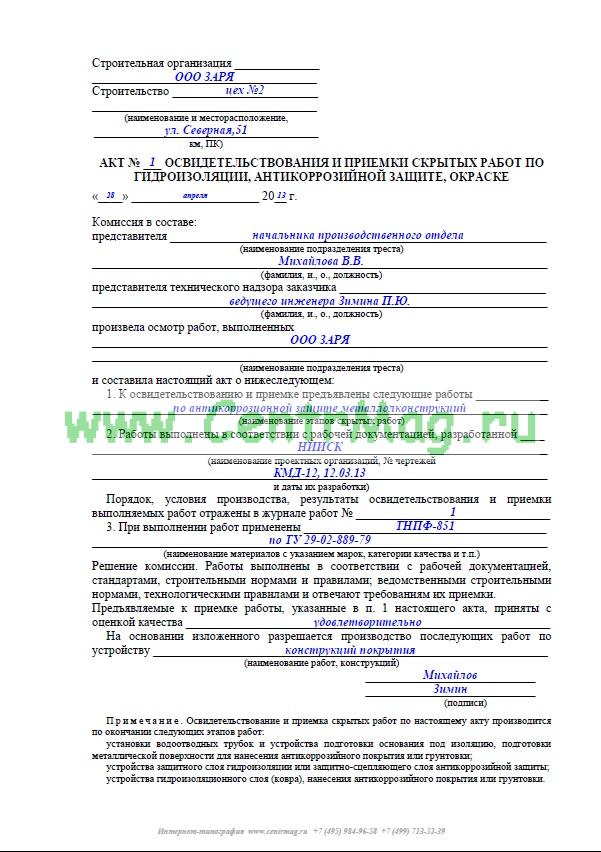 Образец и пример заполнения акта освидетельствования и приемки скрытых работ по гидроизоляции,антикоррозионной защите,окраске