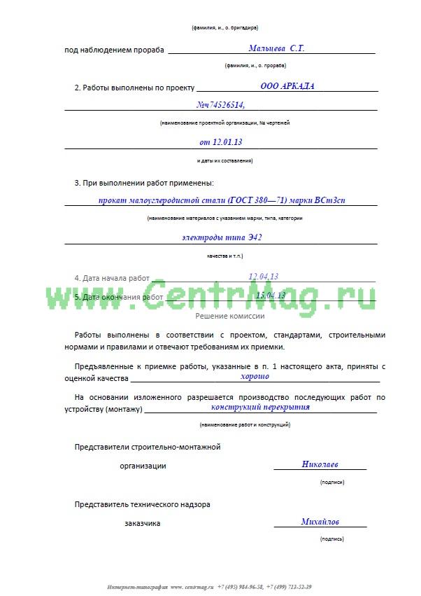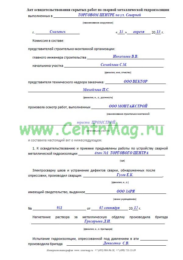 Образец и пример заполнения акта освидетельствования скрытых работ по сварной металлической гидроизоляции