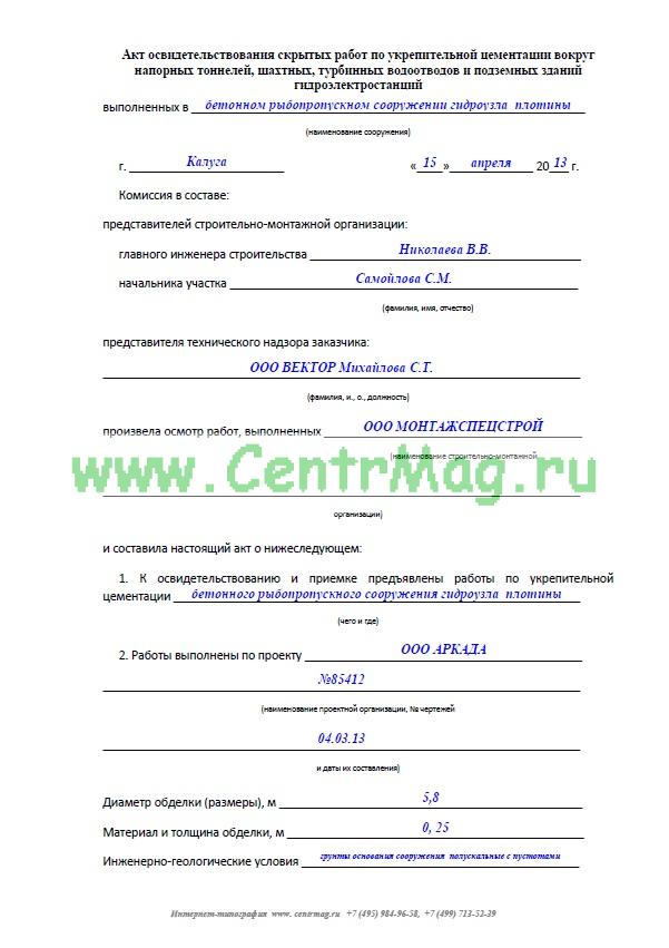 Образец и пример заполнения акта освидетельствования скрытых работ по укрепительной цементации вокруг напорных тоннелей, шахтных, турбинных водоотводов и подземных зданий гидроэлектростанций
