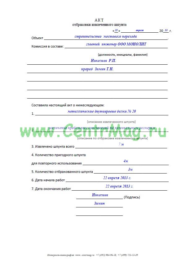 Образец и пример заполнения акта отбраковки извлеченного шпунта