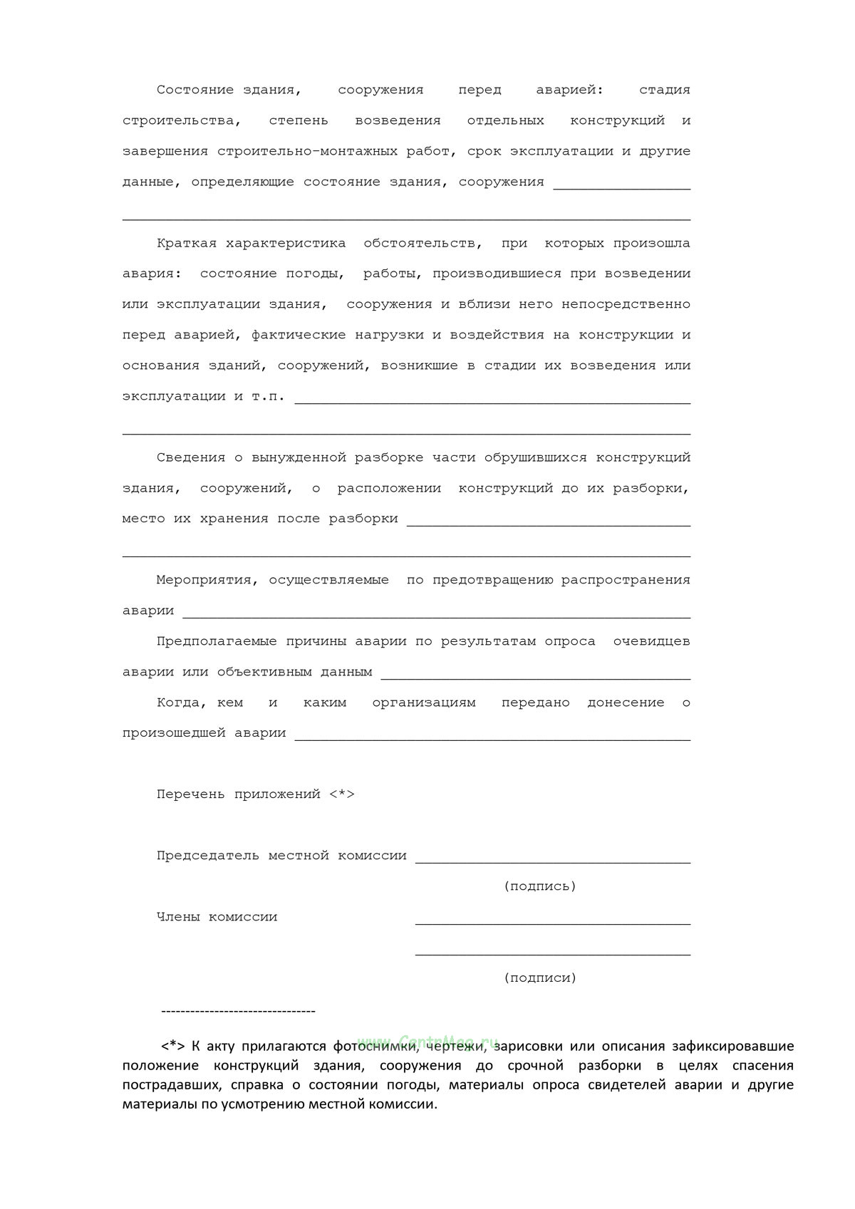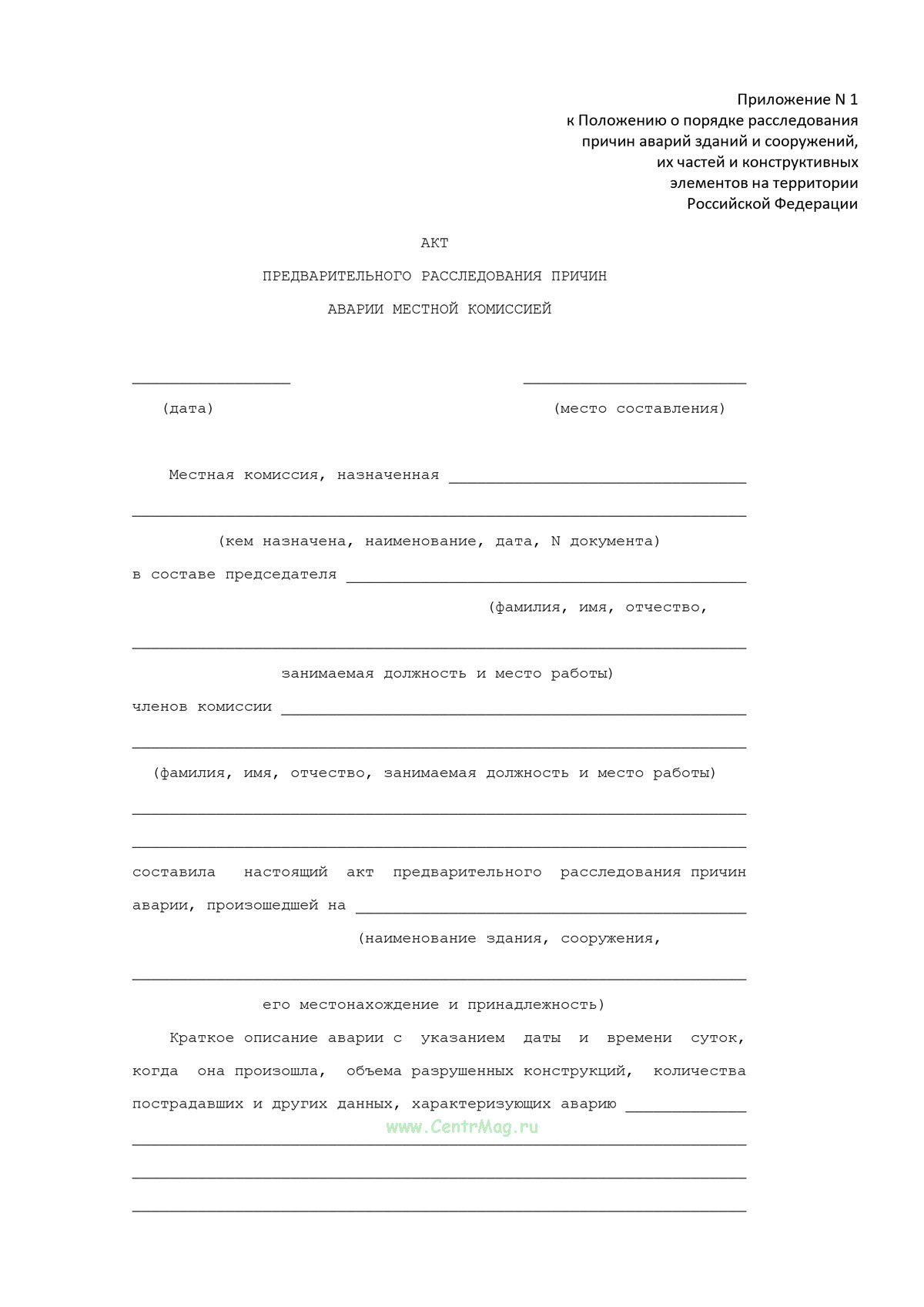 Форма акта предварительного расследования причин аварии местной комиссией соответствует Приложению N 1 к Приказу Минстроя РФ от 06.12.1994 N 17-48 "О порядке расследования причин аварий зданий и сооружений на территории Российской Федерации"