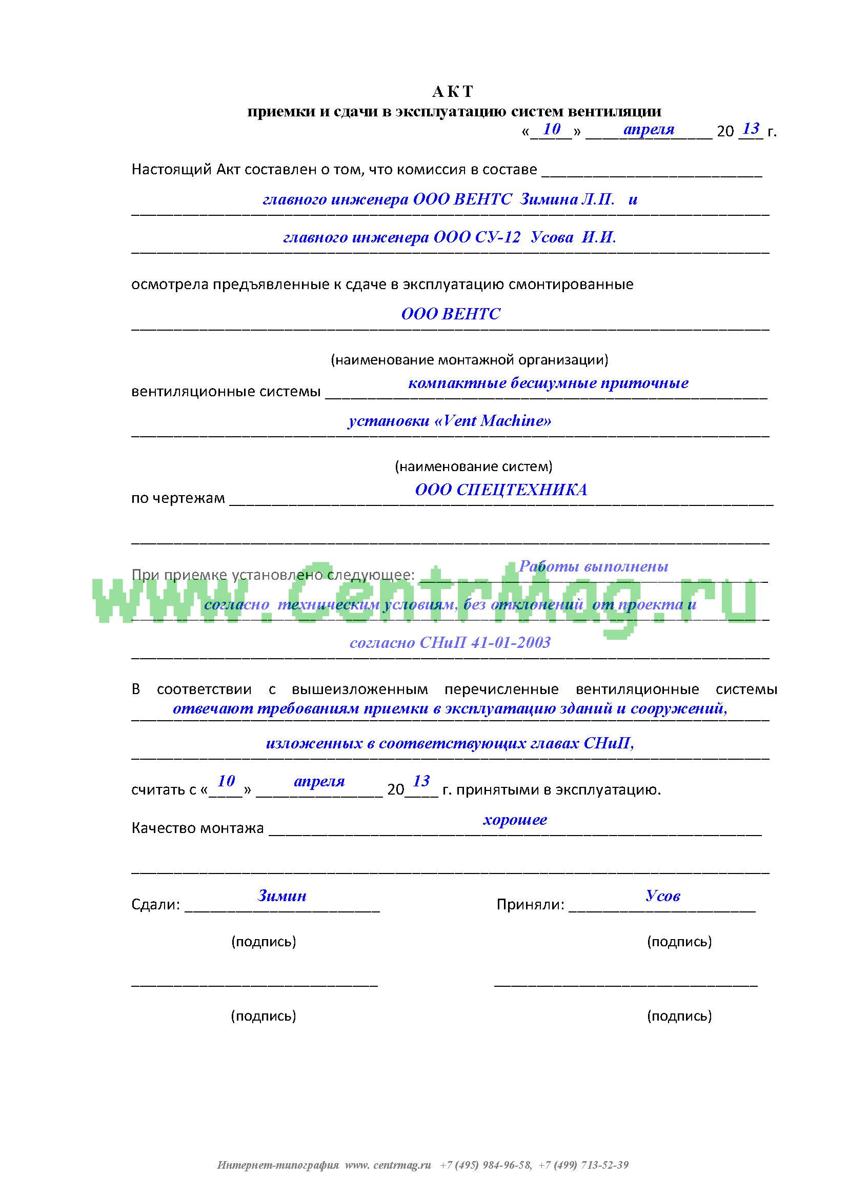 Образец и пример заполнения акта приемки и сдачи в эксплуатацию систем вентиляции