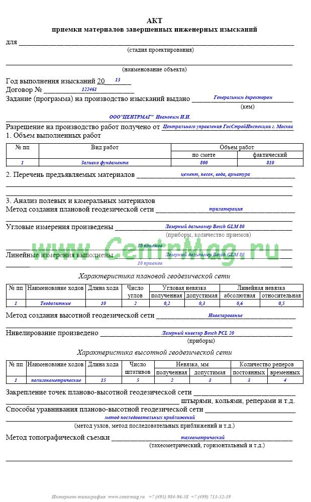 Образец и пример заполнения акта приемки материалов завершенных инженерных изысканий
