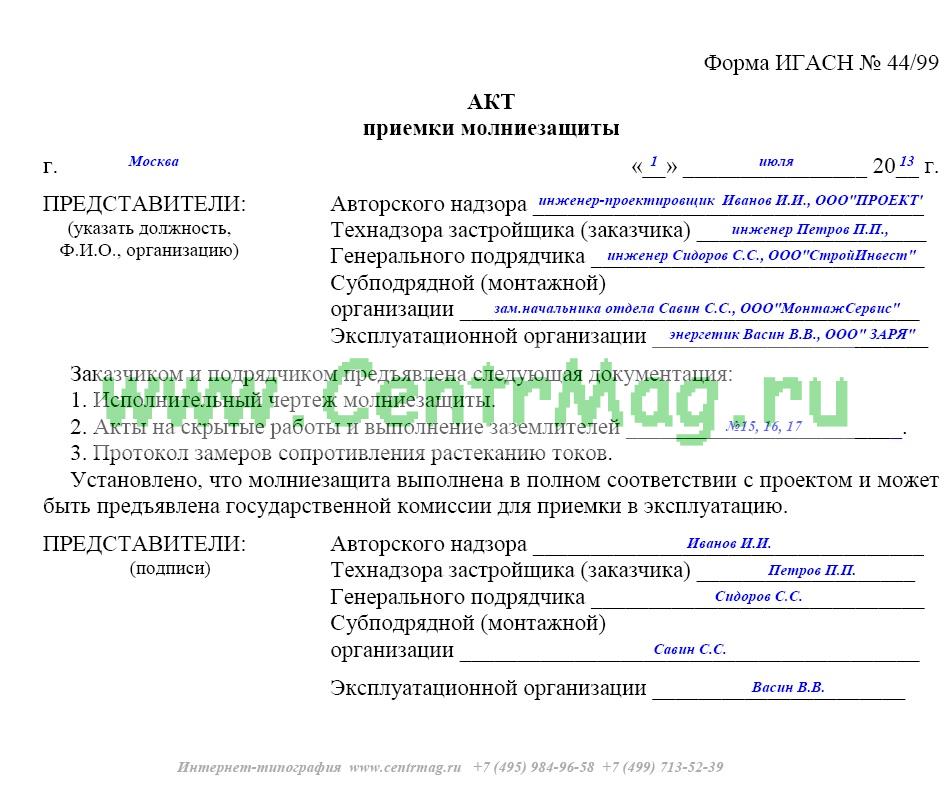 Акт приемки молниезащиты расположен на 1 листе формата 210х297мм.