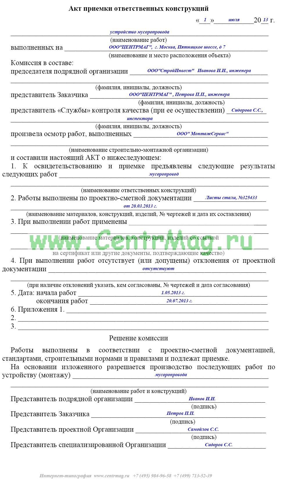 Образец и пример заполнения акта приемки ответственных конструкций