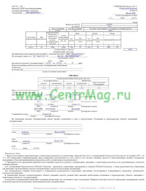 Акт приемки-сдачи отремонтированных (модернизированных) объектов - унифицированная форма N ОС-3, уУтверждена Постановлением Госкомстата России от 21.01.2003 N 7.