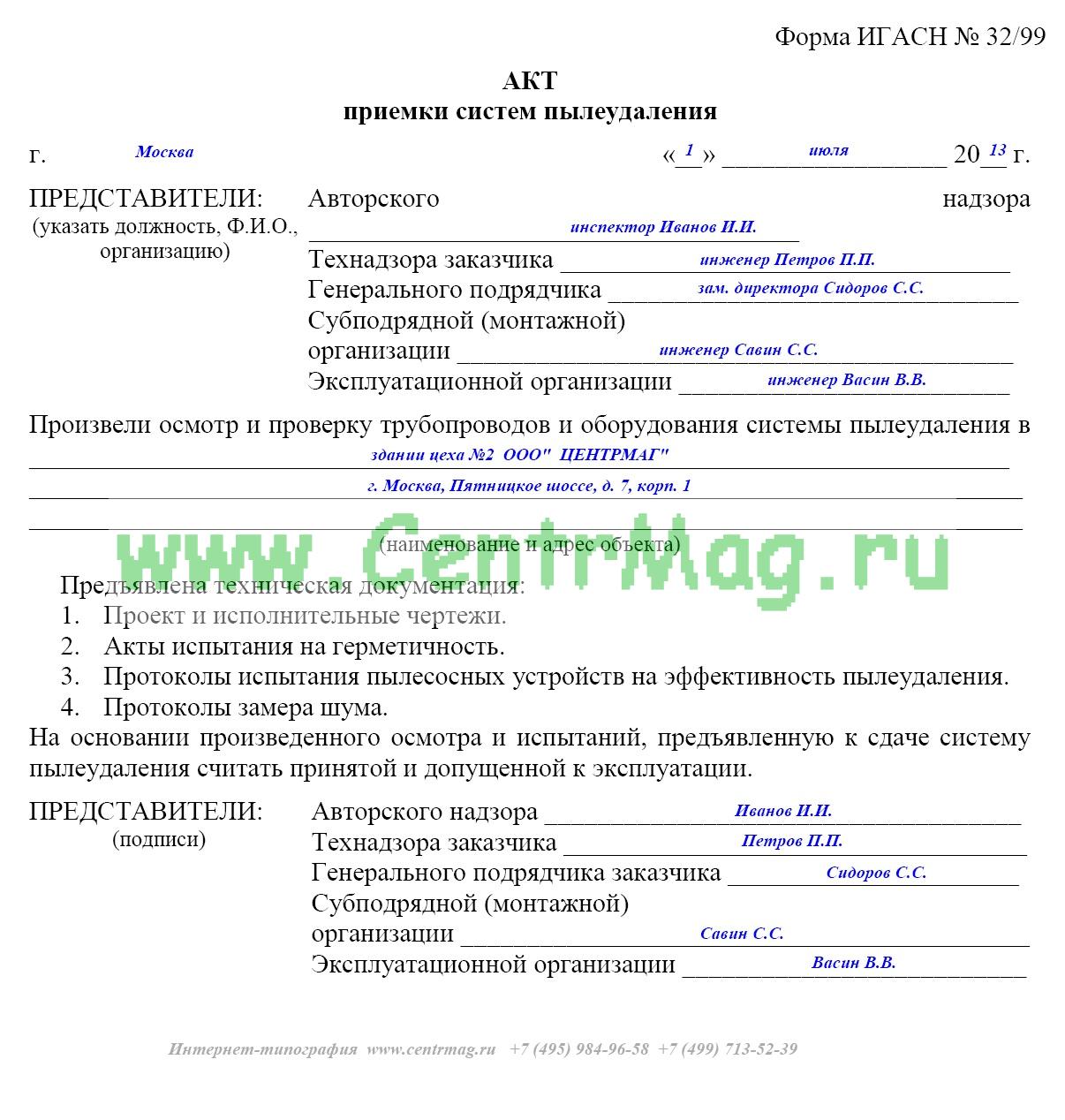 Акт приемки систем пылеудаления является формой ИГАСН 32/99.