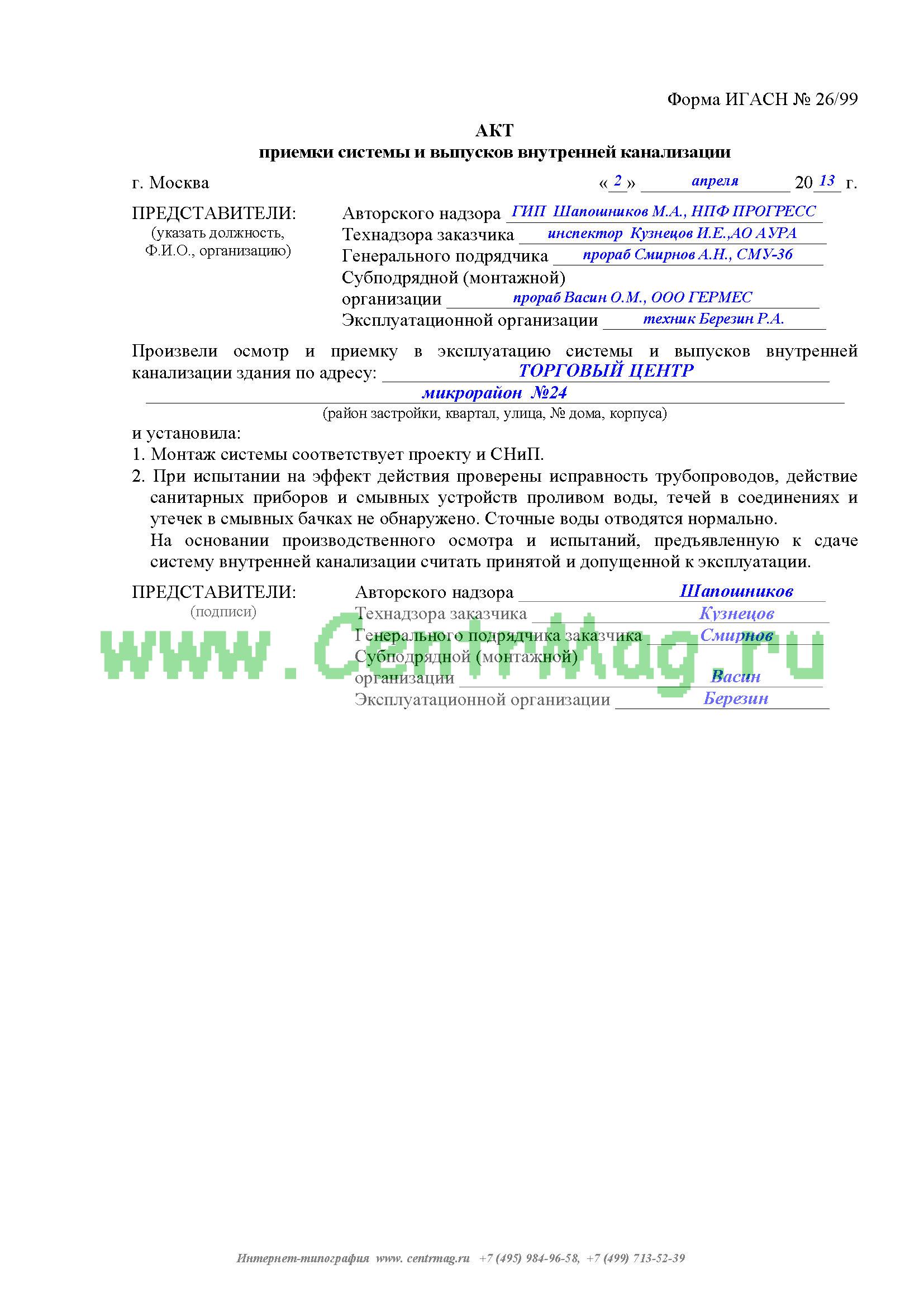 Образец и пример заполнения акта приемки системы и выпусков внутренней канализации