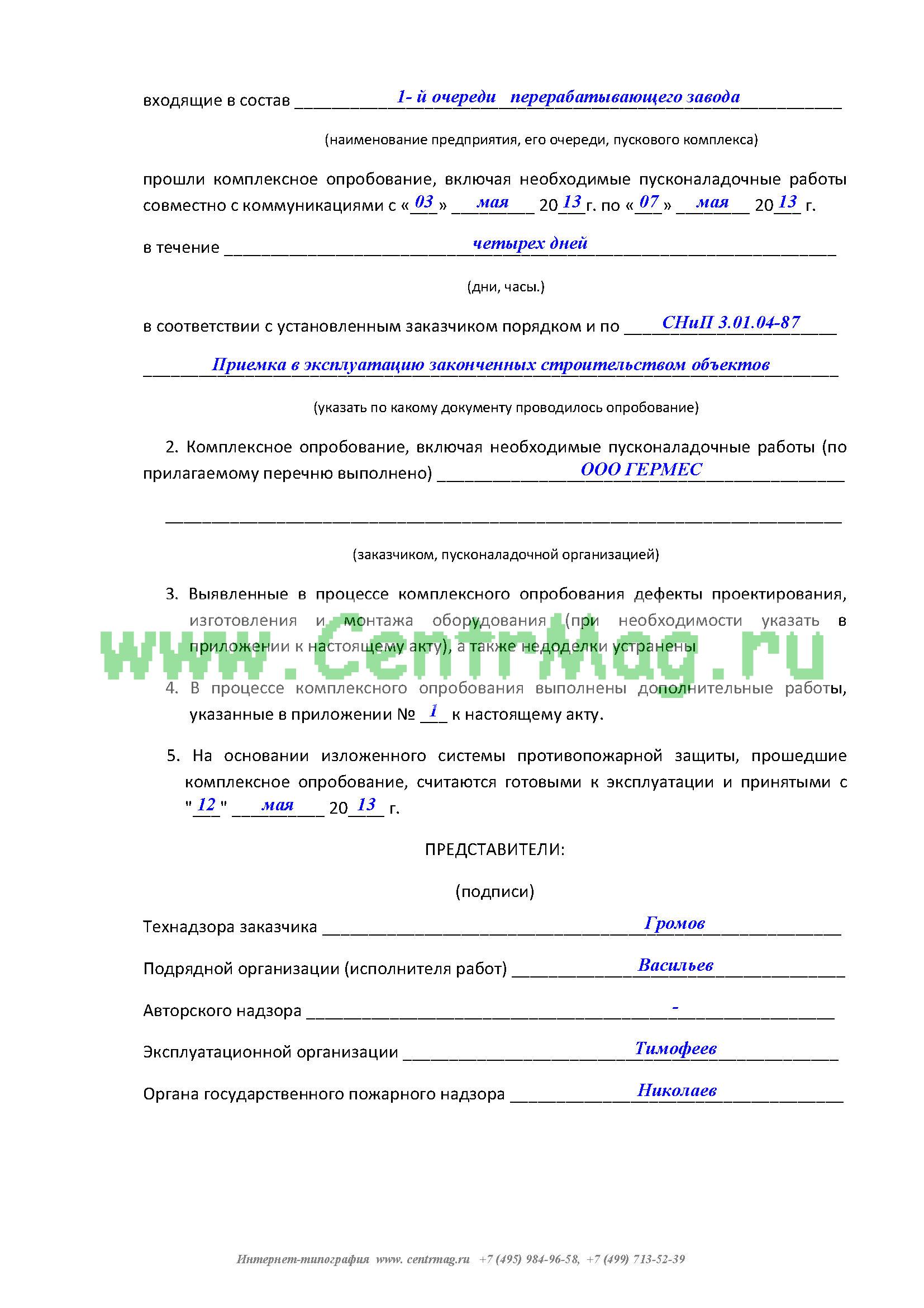 Образец и пример заполнения акта приёмки системы противопожарной защиты после комплексного опробования