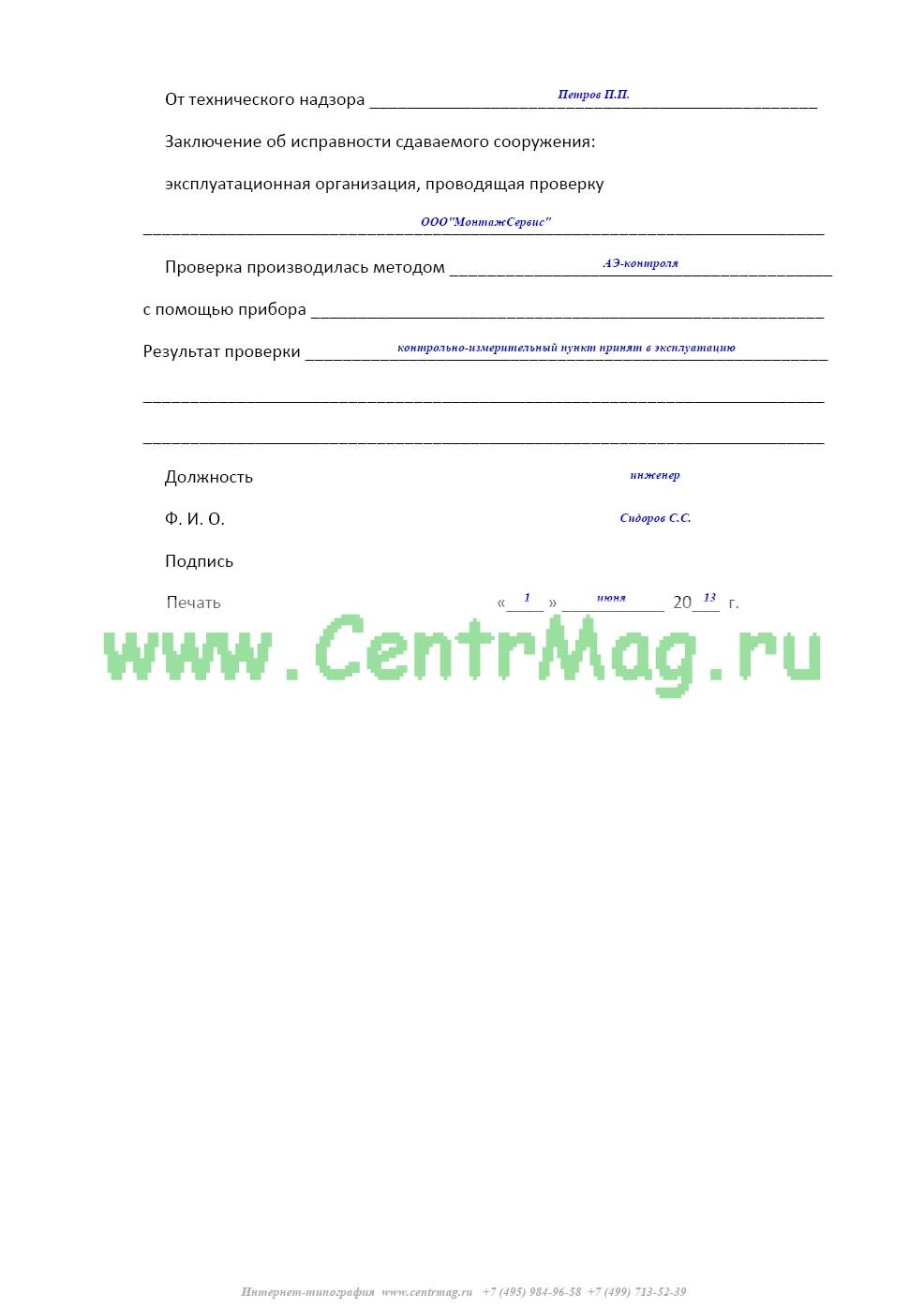 Образец и пример заполнения акта приемки в эксплуатацию контактных устройств, потенциалоуравнивающих перемычек и контрольно-измерительных пунктов
