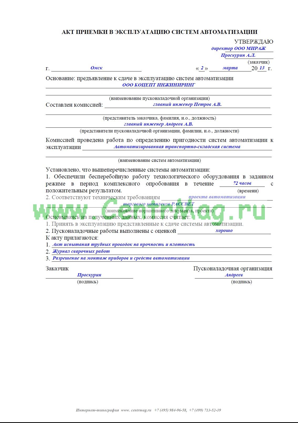 Образец и пример заполнения акта приемки в эксплуатацию систем автоматизации
