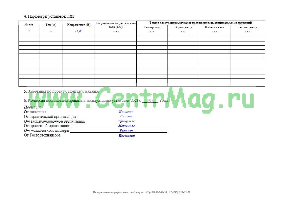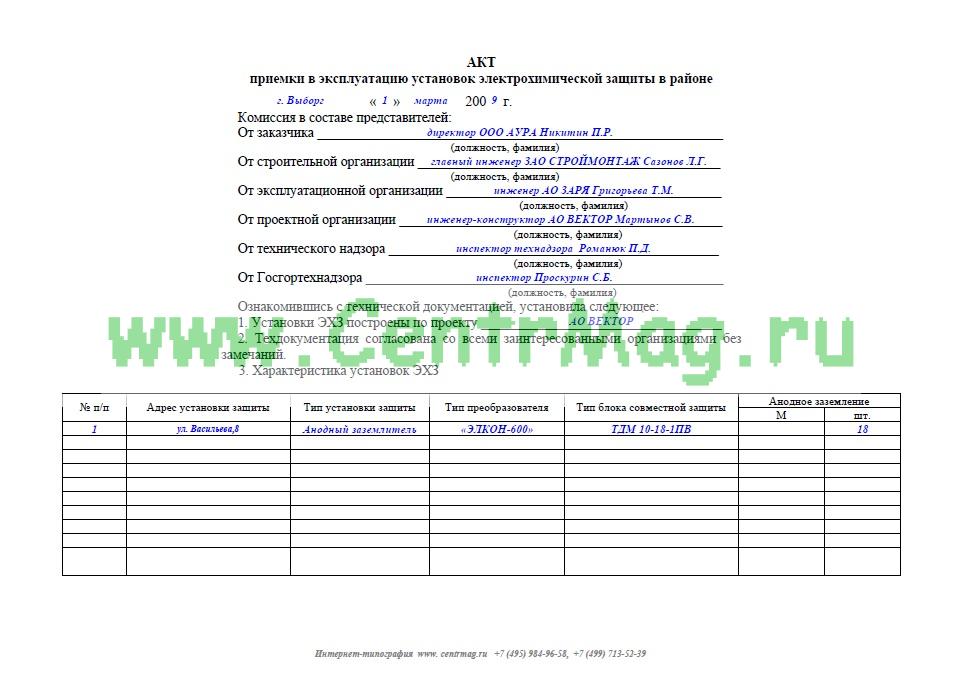 Образец и пример заполнения акта приемки в эксплуатацию установок электрохимической защиты в районе