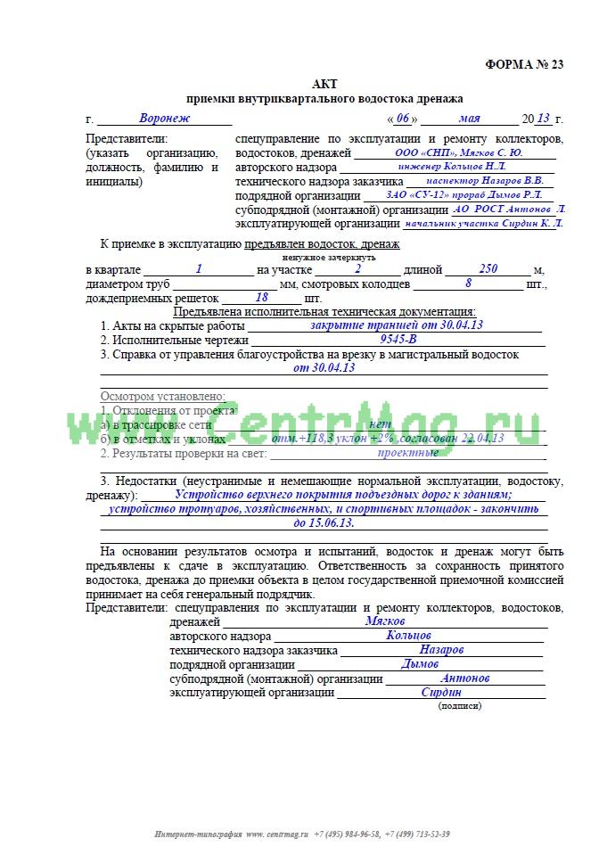 Образец и пример заполнения акта приемки внутриквартального водостока дренажа