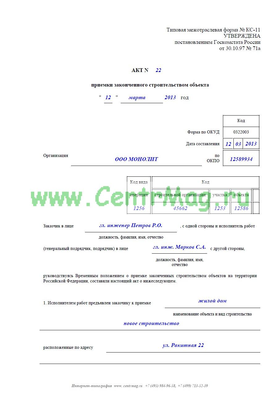 Акт приемки законченного строительством объекта, форма КС-11 соответствует Постановлению Госкомстата РФ от 30.10.1997 № 71а (ред. от 21.01.2003) "Об утверждении унифицированных форм первичной учетной документации по учету труда и его оплаты, основных средств и нематериальных активов, материалов, малоценных и быстроизнашивающихся предметов, работ в капитальном строительстве"
