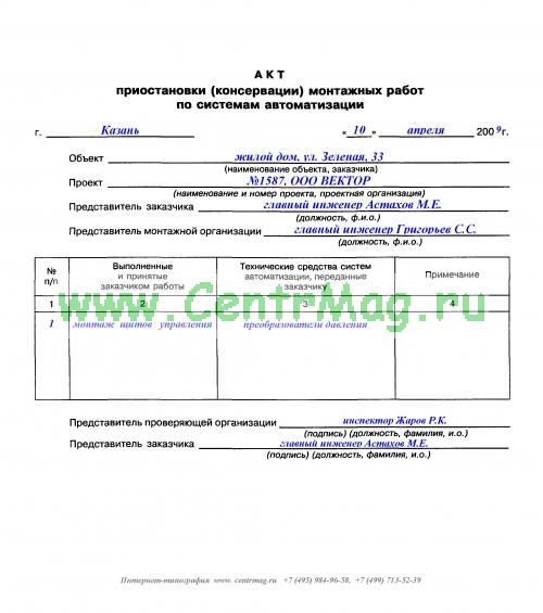 Образец и пример заполнения акта приостановки (консервации) монтажных работ по системам автоматизации
