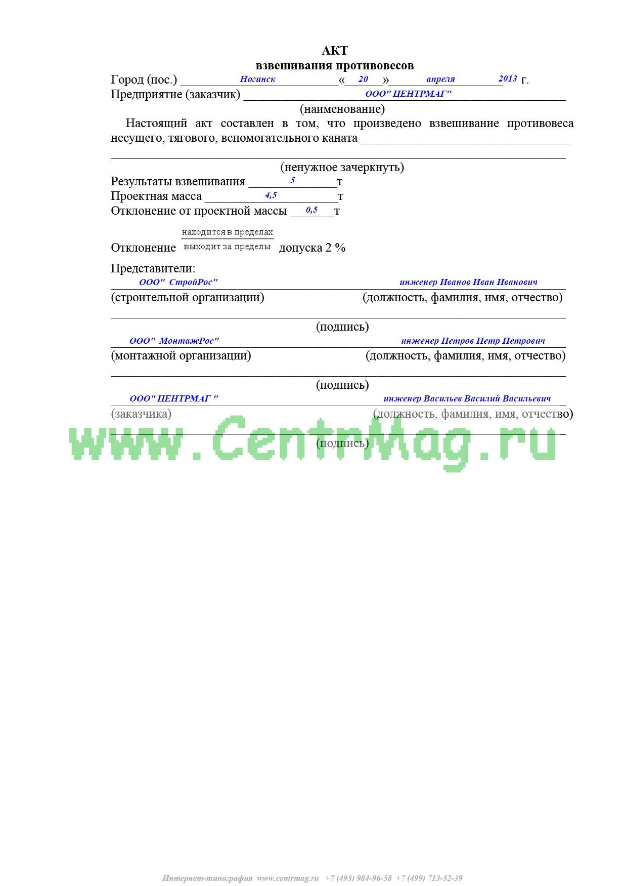Образец и пример заполнения акта взвешивания противовесов