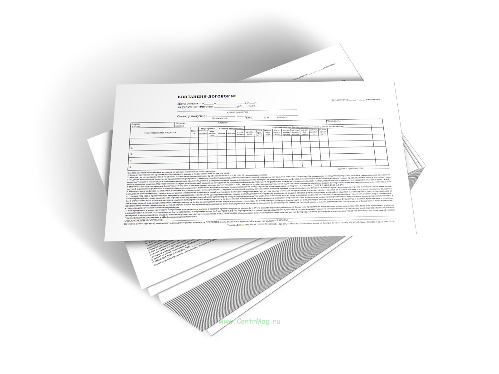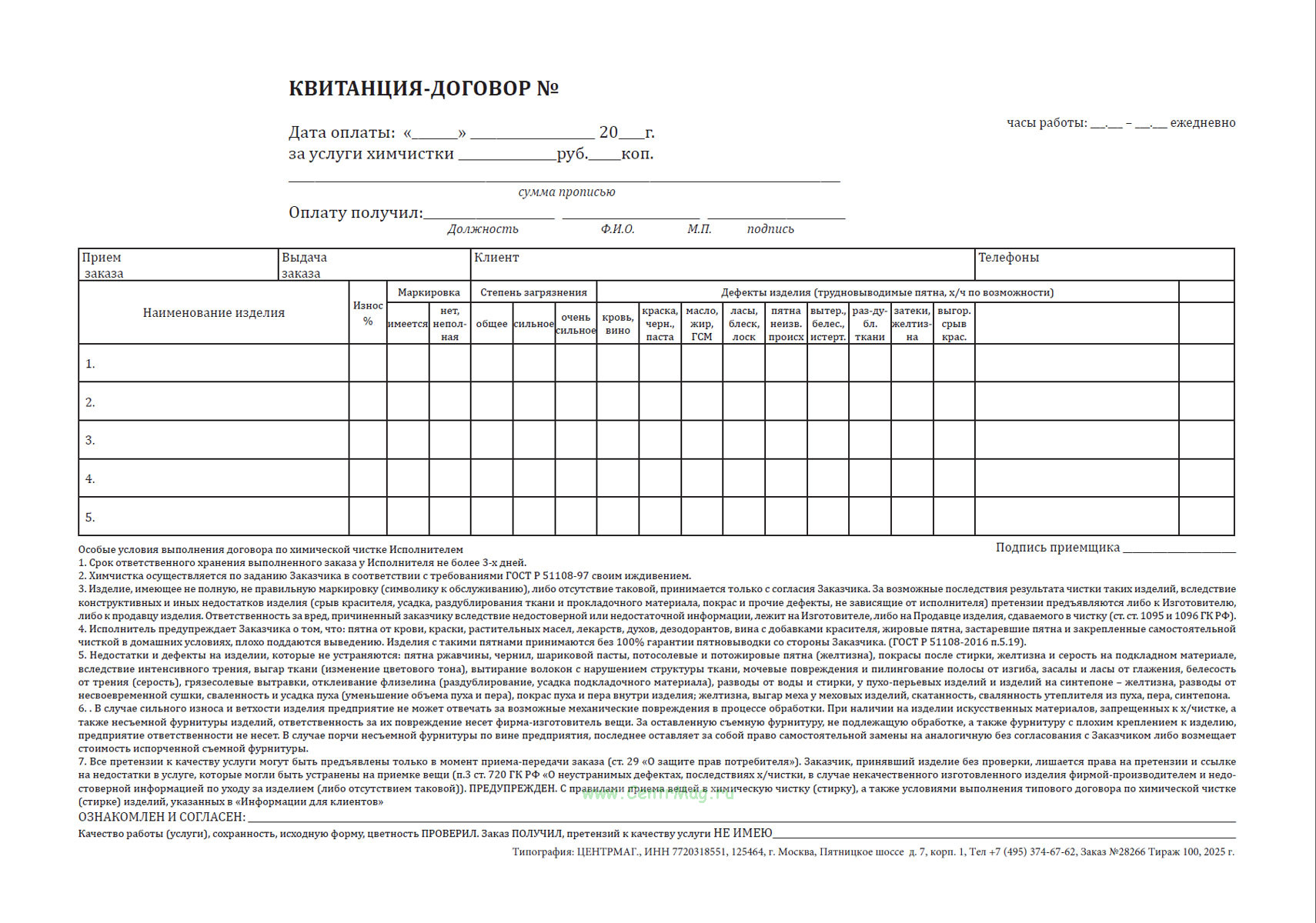 Квитанция-договор за услуги химчистки (бланк строгой отчетности двухслойный самокопирующий) продается только как чистый незаполненный бланк, без печатей и подписей и соответствует 149-ФЗ от 27.07.2006