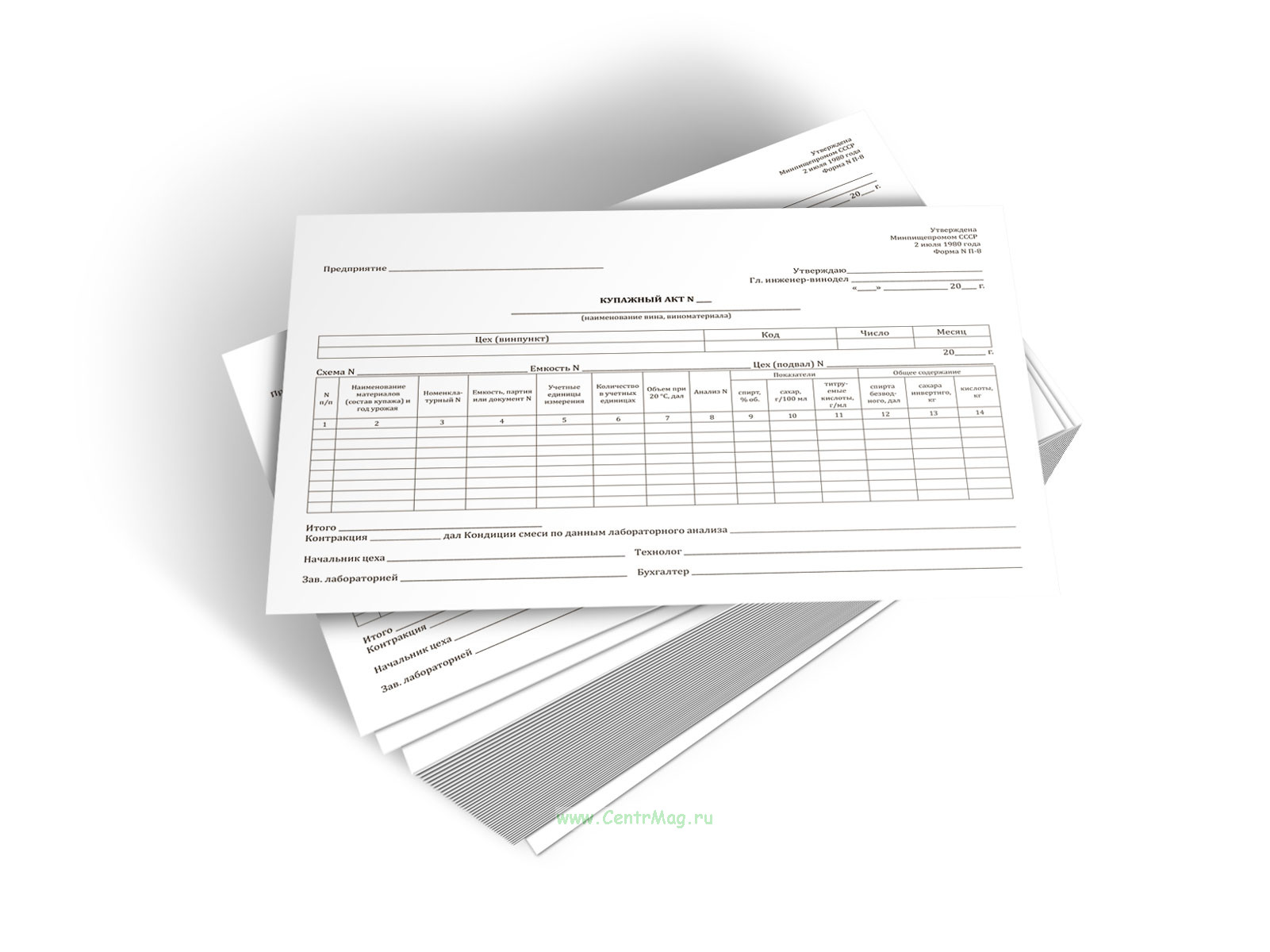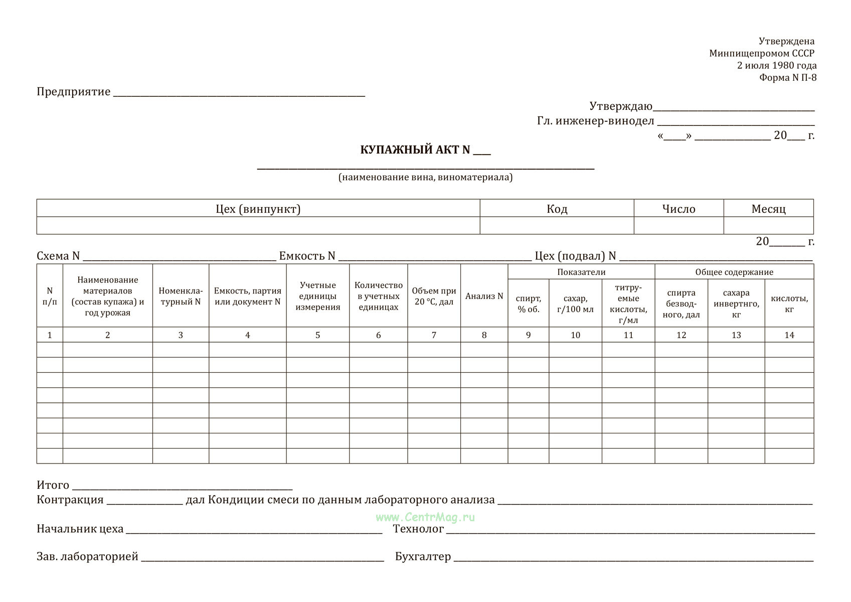 Форма Купажного акта (Форма N П-8) приведена в "Формах первичного учета в винодельческой промышленности и указания о порядке их применения и заполнения", утв. Минпищепромом СССР 02.07.1980.