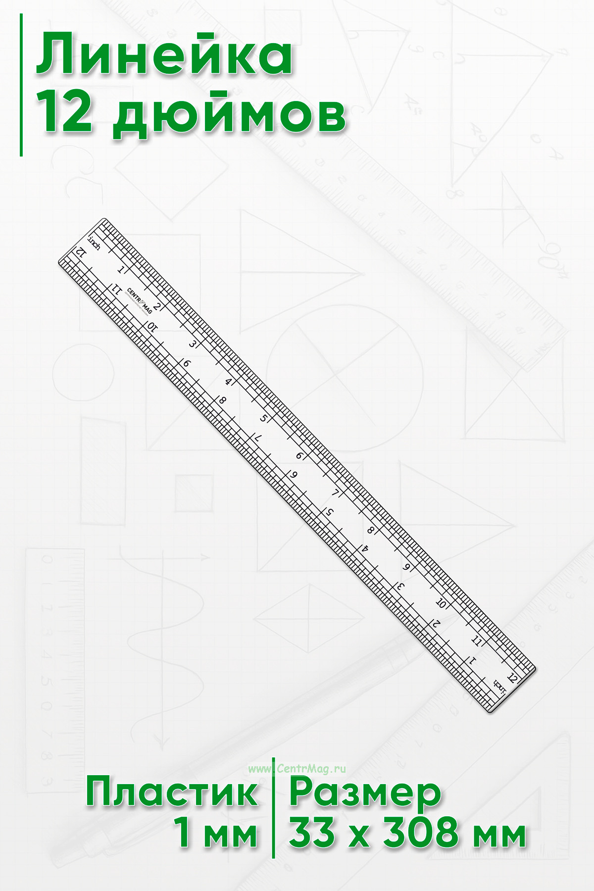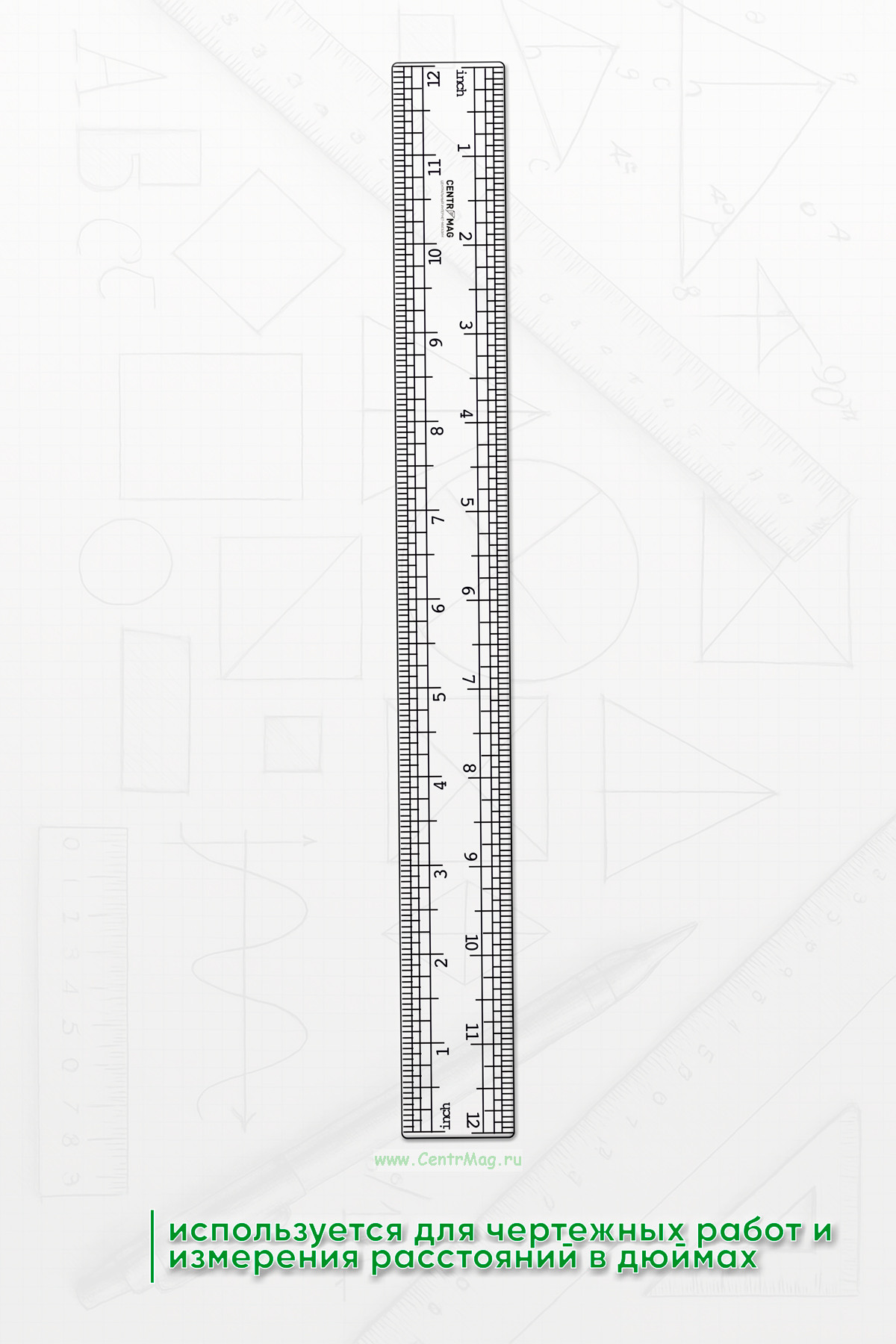 Линейка содержит с двух сторон шкалы по 12 дюймов и используется для чертежных работ и измерения расстояний в дюймах.