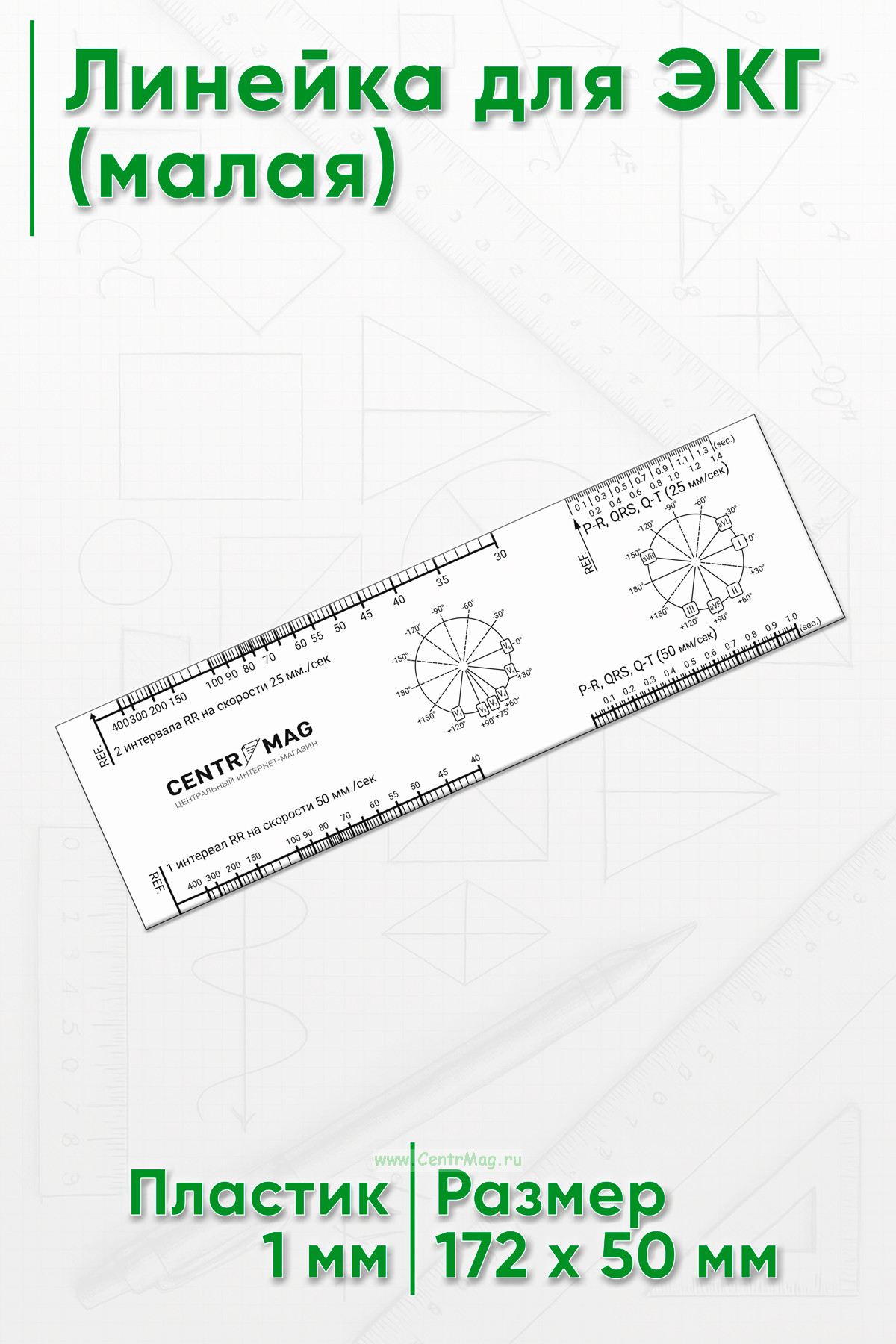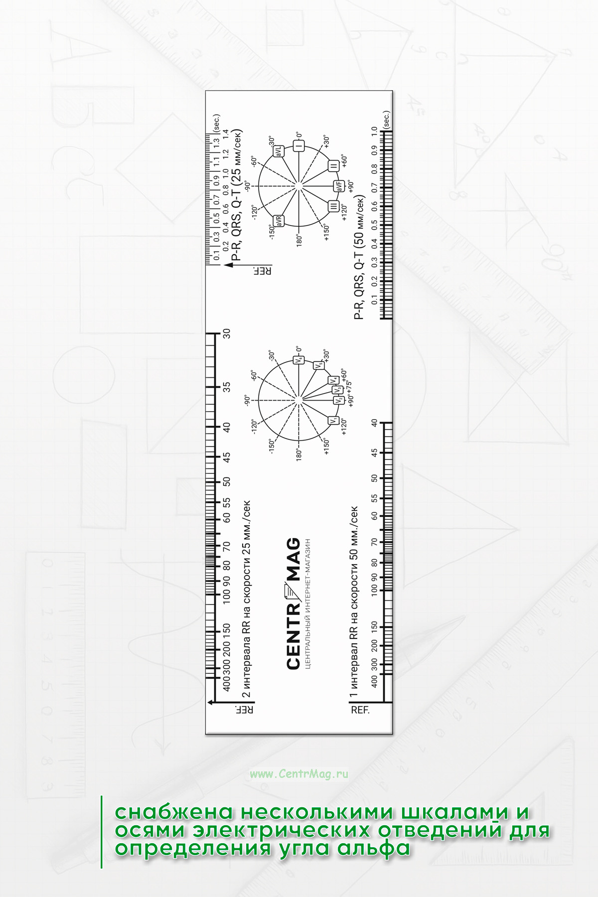 Это небольшая линейка для анализа ЭКГ снабжена несколькими шкалами и осями электрических отведений для определения угла альфа