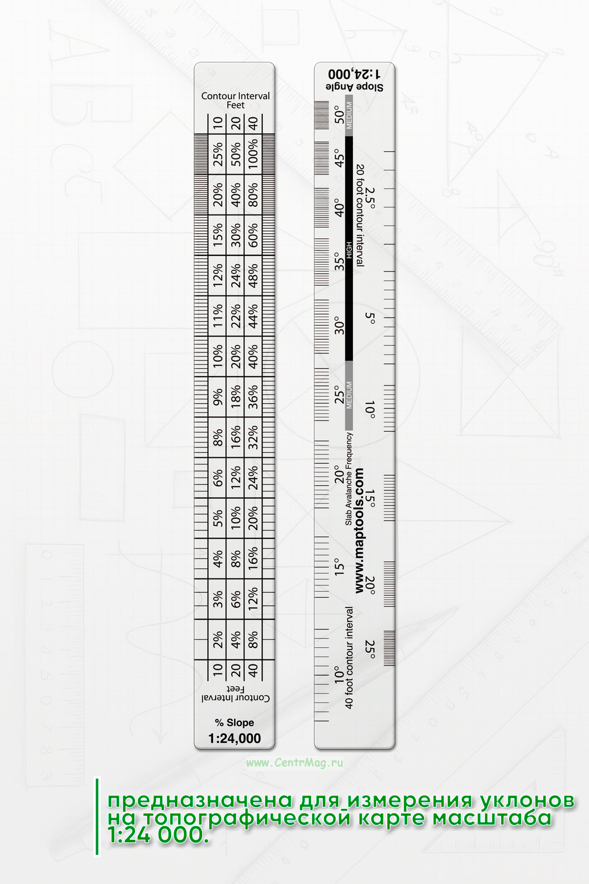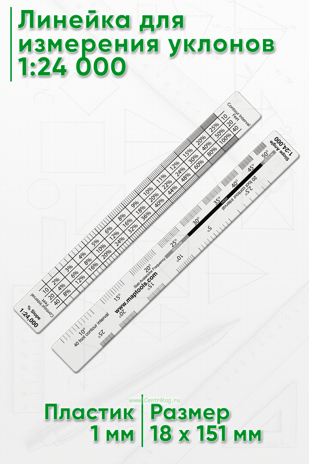 Эта линейка предназначена для измерения уклонов на топографической карте масштаба 1:24 000. Уклон определяется путем сравнения расстояния между контурными линиями с образцами на краю линейки. Лицевая сторона линейки предназначена для измерения процентного уклона карт с интервалом между контурами 10, 20 или 40 футов. Обратная сторона линейки измеряет наклон в градусах для карт с интервалом между контурами 20 или 40 футов. На обратной стороне также указана частота схода лавин на различных склонах на карте с интервалом в 40 футов.