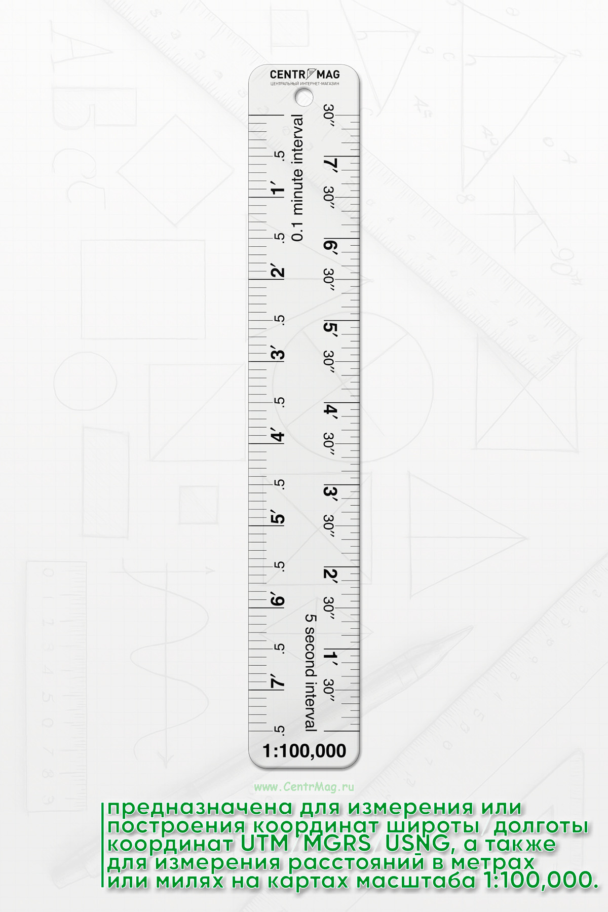 Линейка предназначена для измерения или построения координат широты/долготы, координат UTM/MGRS/USNG, а также для измерения расстояний в метрах или милях на картах масштаба 1:100,000.
