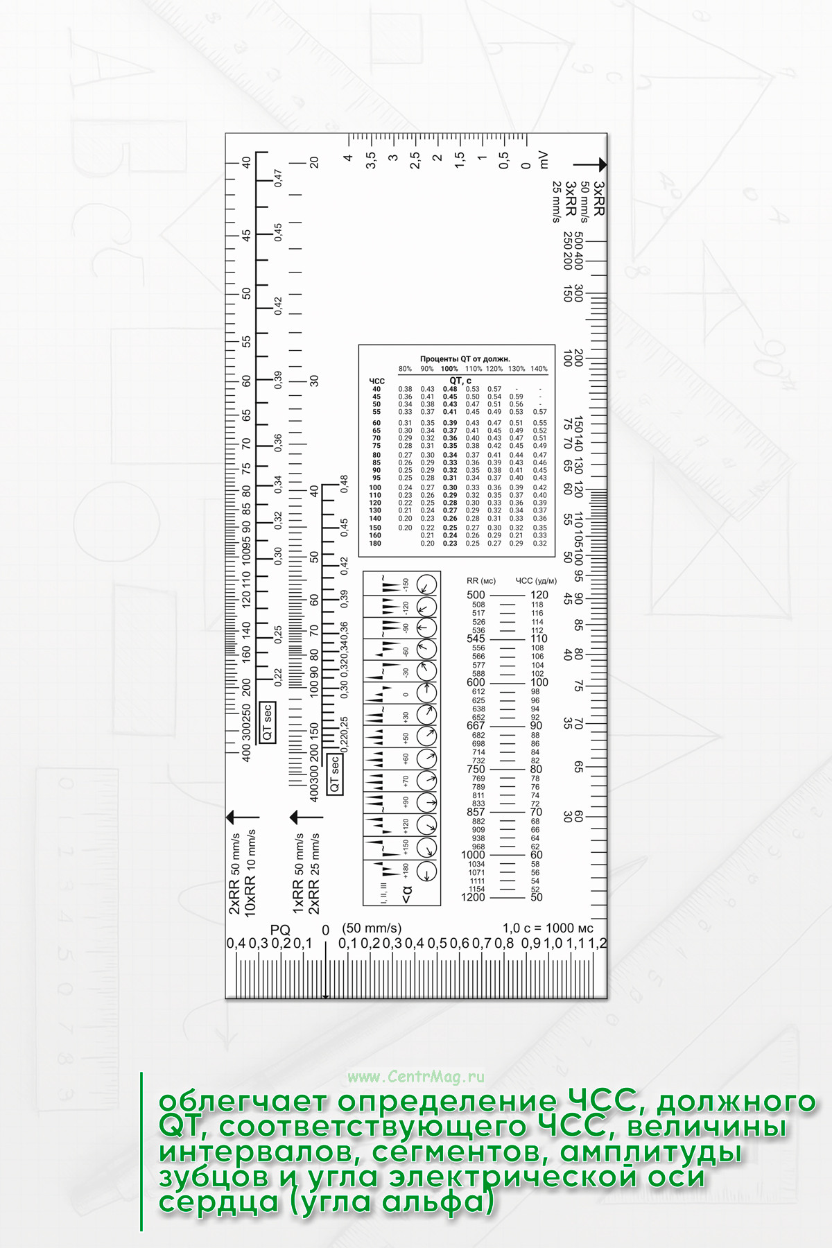 Представленная линейка облегчает определение ЧСС, должного QT, соответствующего ЧСС, величины интервалов, сегментов, амплитуды зубцов и угла электрической оси сердца (угла альфа).