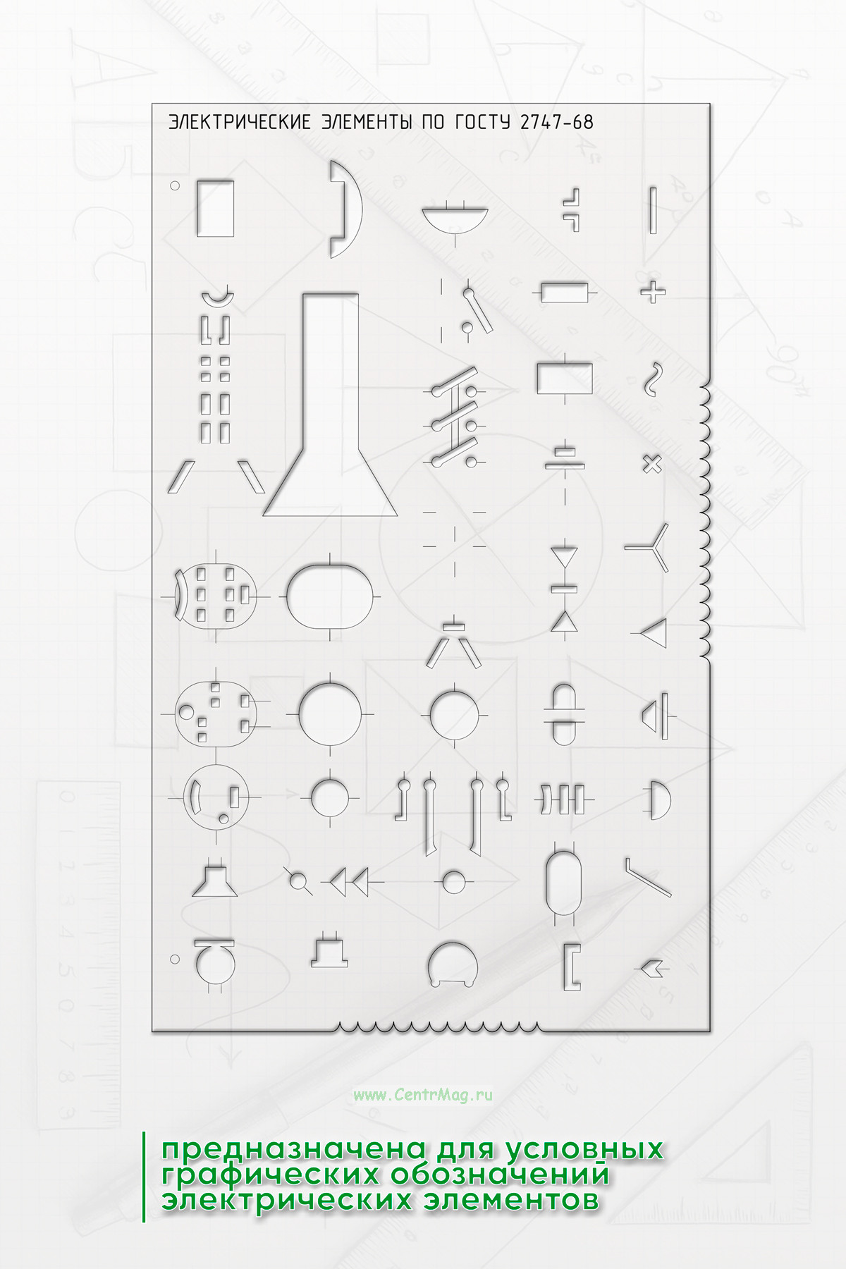 Линейка предназначена для условных графических обозначений электрических элементов. Размеры условных графических обозначений соответствуют ГОСТу 2747-68.