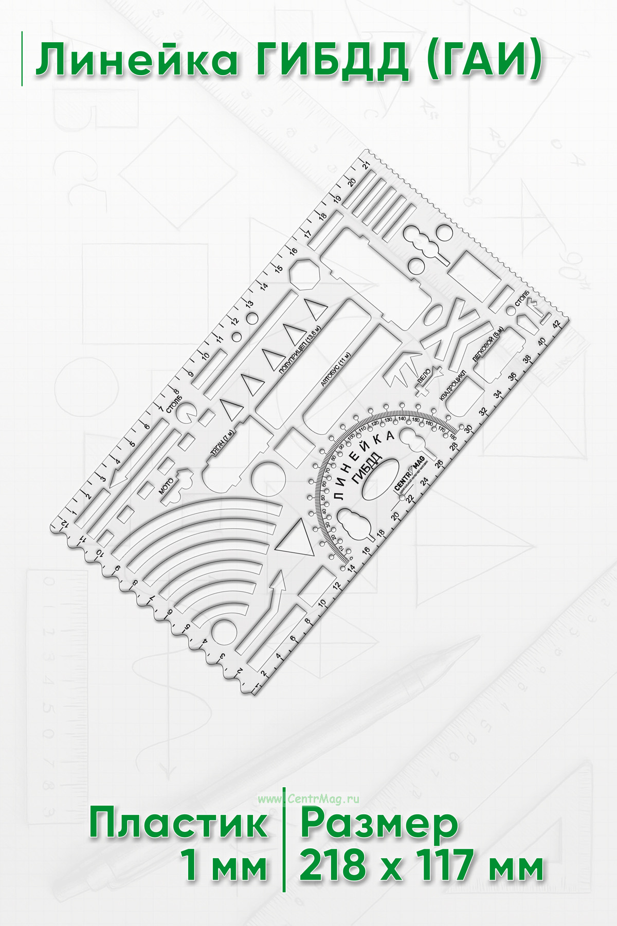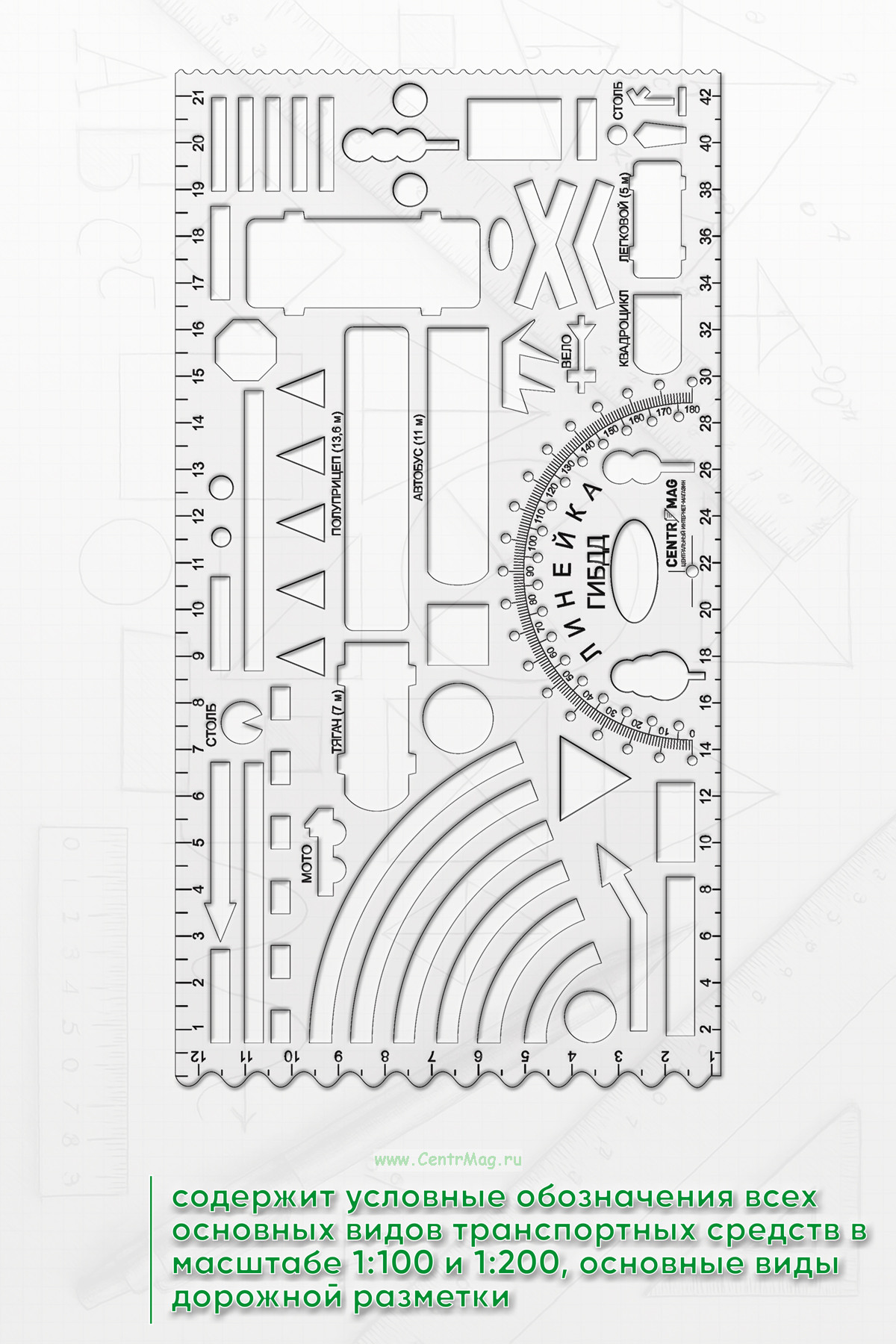 Линейка для инспектора ГИБДД содержит условные обозначения всех основных видов транспортных средств в масштабе 1:100 и 1:200, основные виды дорожной разметки (соотношения длин и интервалов по ГОСТ), а также фигуры частых дорожных знаков.
