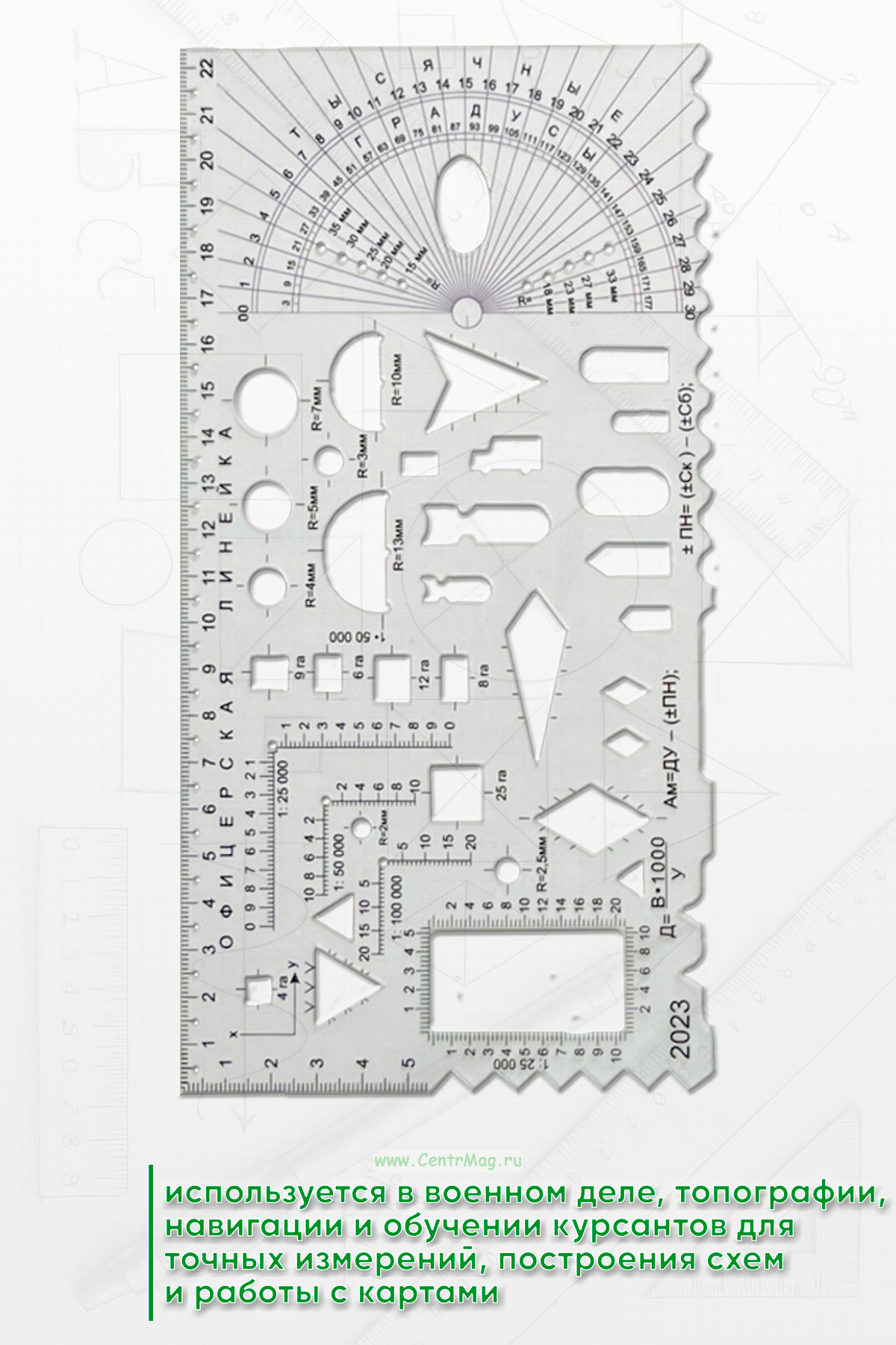 Линейка офицерская, курсантская имеет 39 тактических элемента. Используется в военном деле, топографии, навигации и обучении курсантов для точных измерений, построения схем и работы с картами.