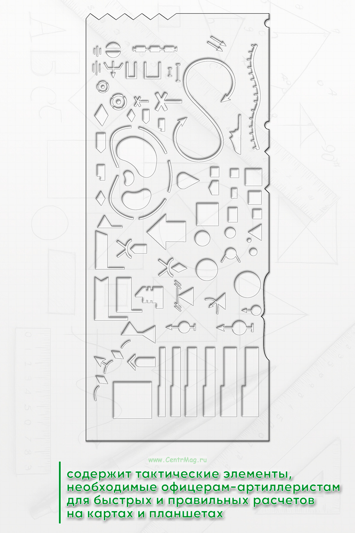 Линейка содержит тактические элементы, необходимые офицерам-артиллеристам для быстрых и правильных расчетов на картах и планшетах.