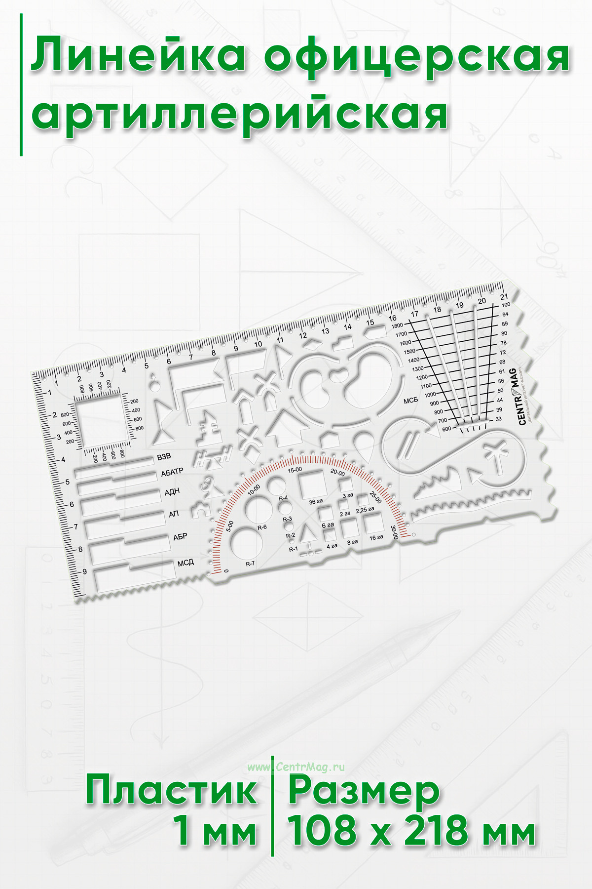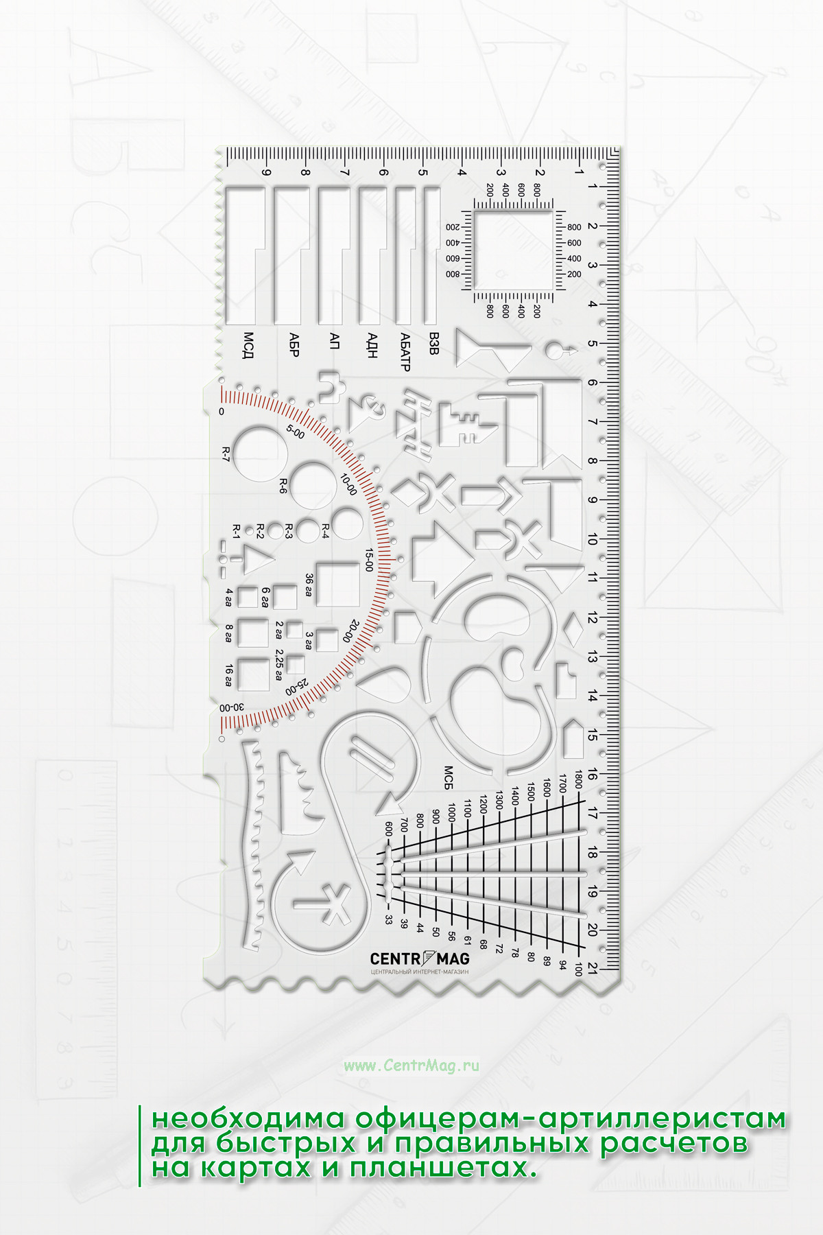 Линейка содержит тактические элементы, необходимые офицерам-артиллеристам для быстрых и правильных расчетов на картах и планшетах.