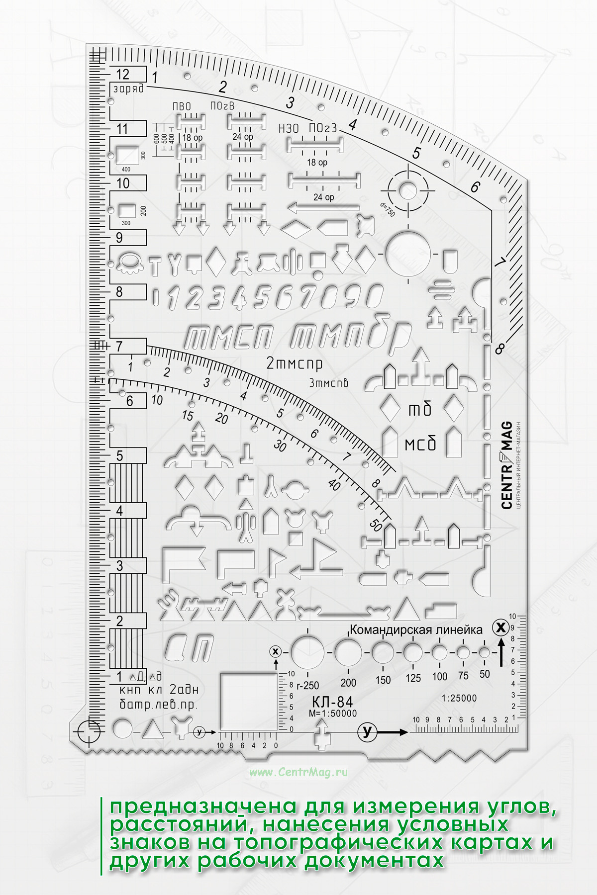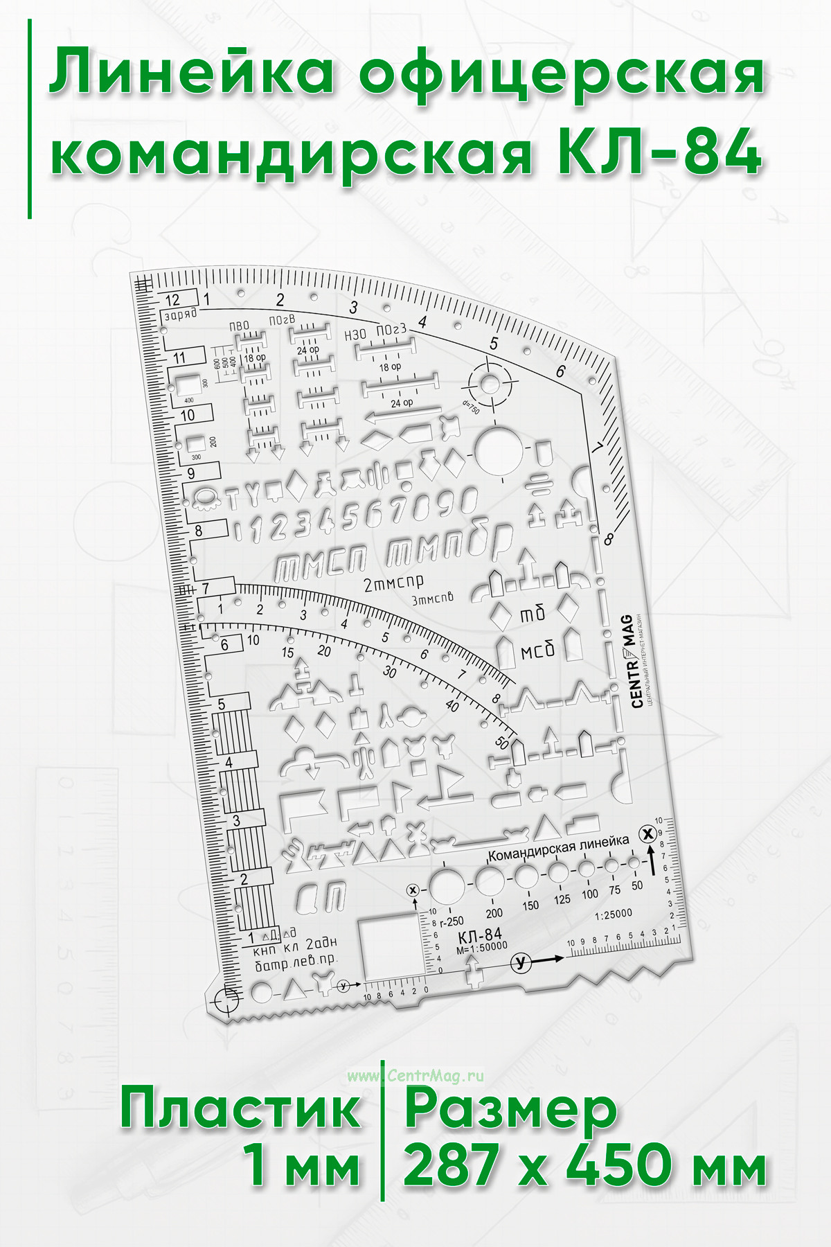 Линейка офицерская командирская КЛ-84 предназначена для измерения углов, расстояний, нанесения условных знаков на топографических картах и других рабочих документах.