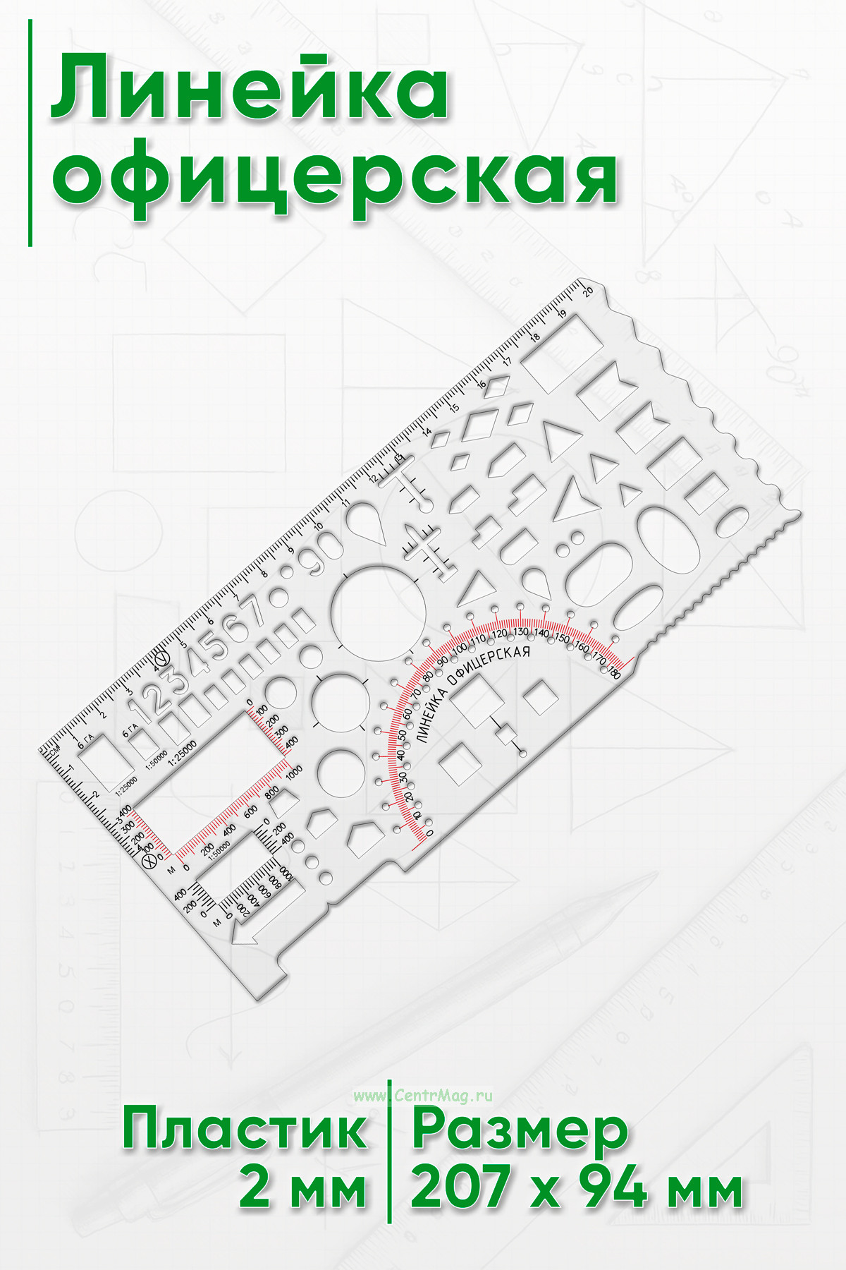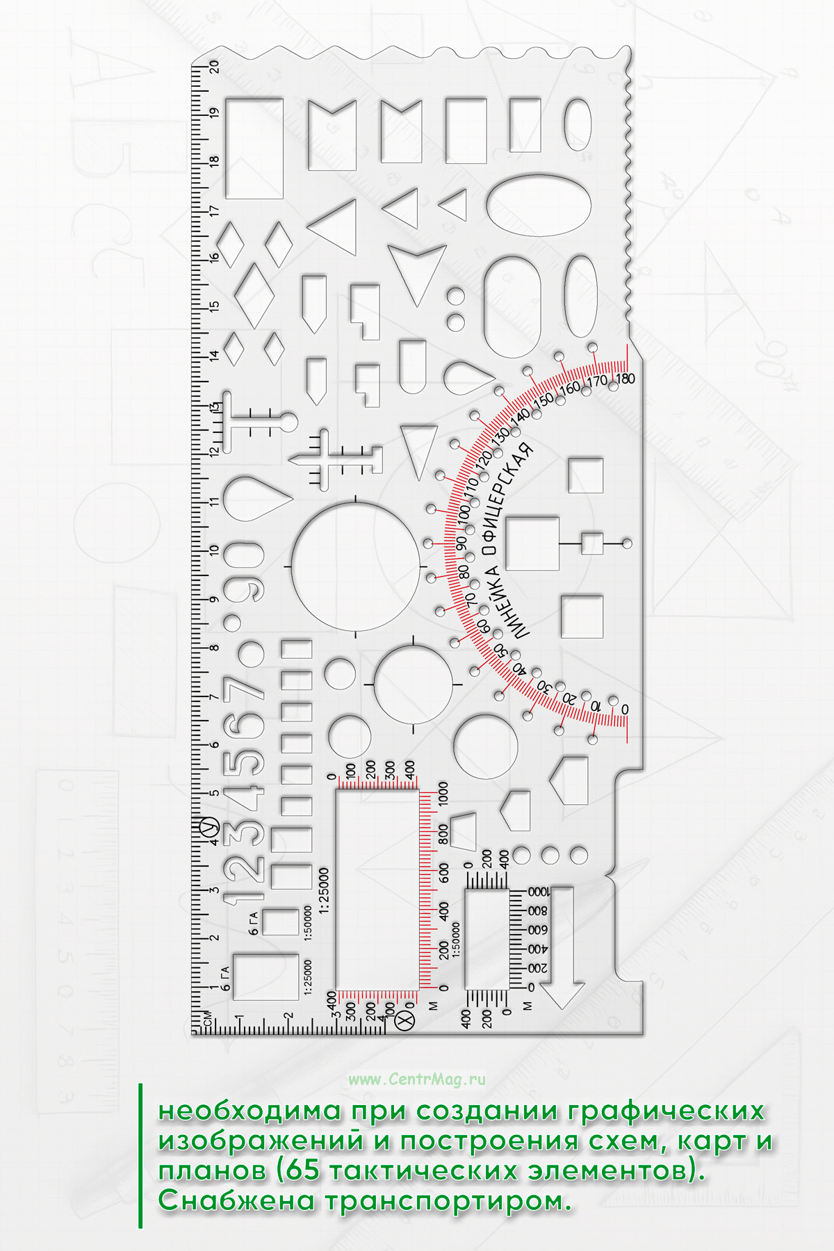 Линейка офицерская необходима при создании графических изображений и построения схем, карт и планов (65 тактических элементов). Снабжена транспортиром.