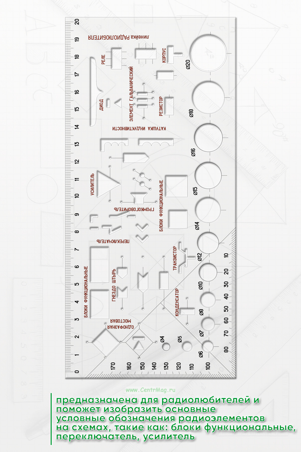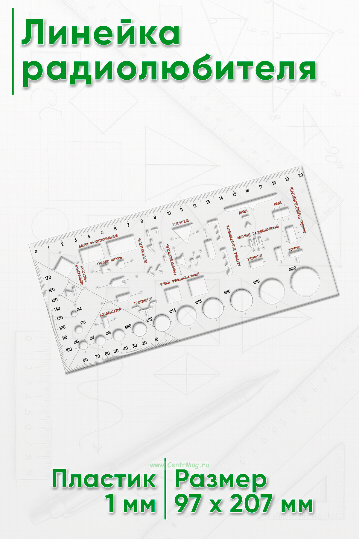 Линейка 20 см предназначена для радиолюбителей и поможет изобразить основные условные обозначения радиоэлементов на схемах, такие как: блоки функциональные, переключатель, усилитель, громкоговоритель, катушка индуктивности, диод, реле и др.