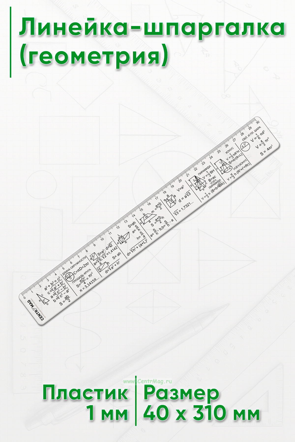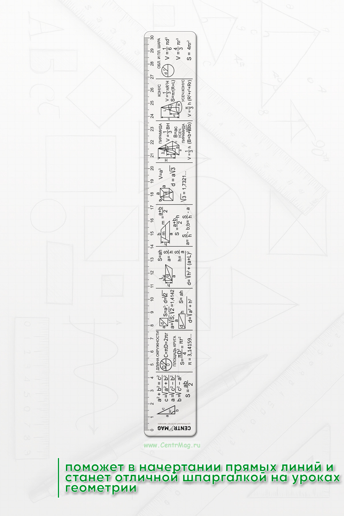 Линейка с математическими формулами поможет в начертании прямых линий и станет отличной шпаргалкой на уроках геометрии.