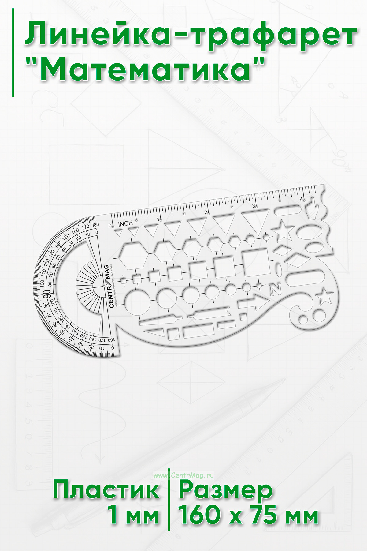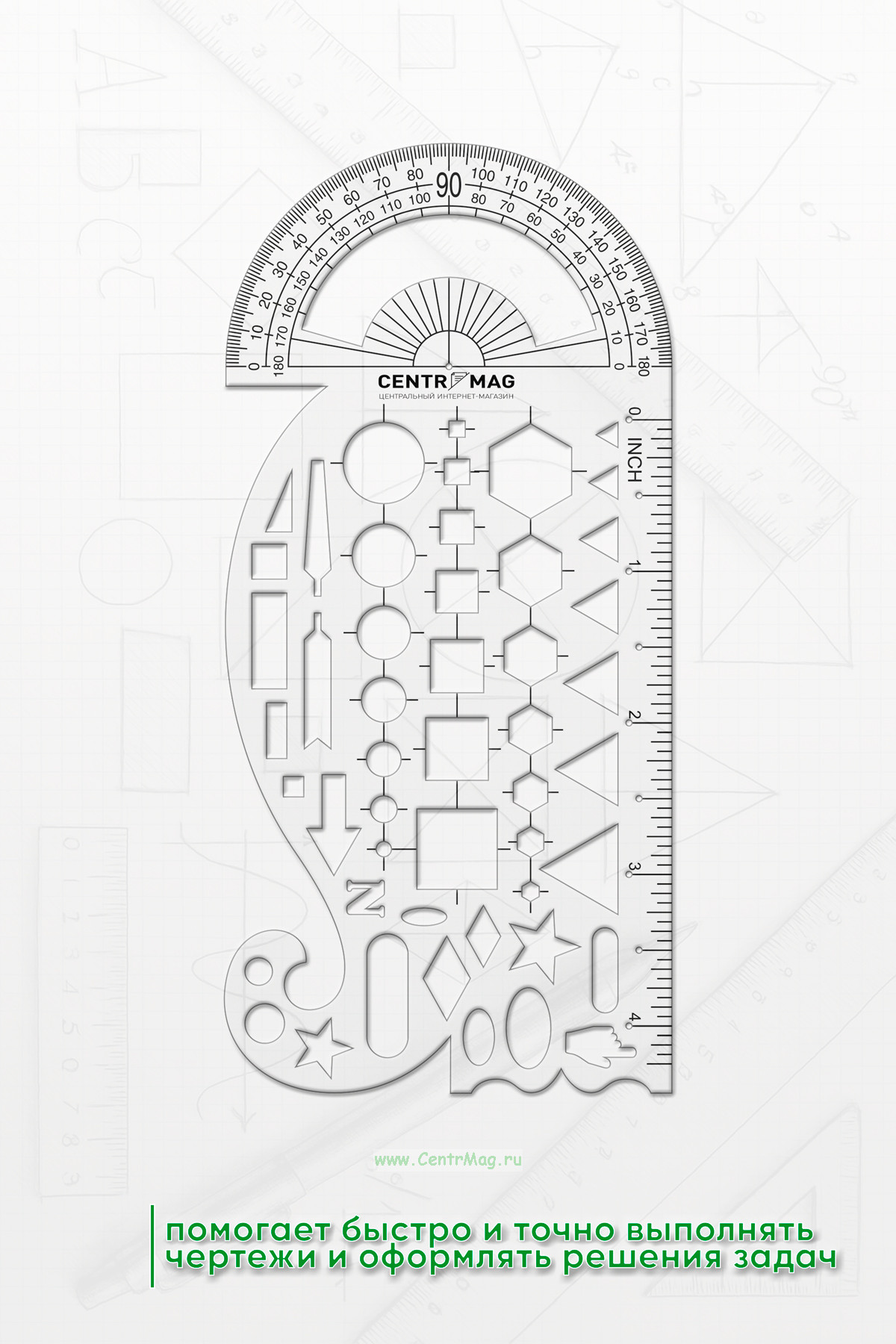 Универсальная измерительная линейка с транспортиром имеет большое количество геометрических фигур. Линейка позволяет чертить параллельные линии.