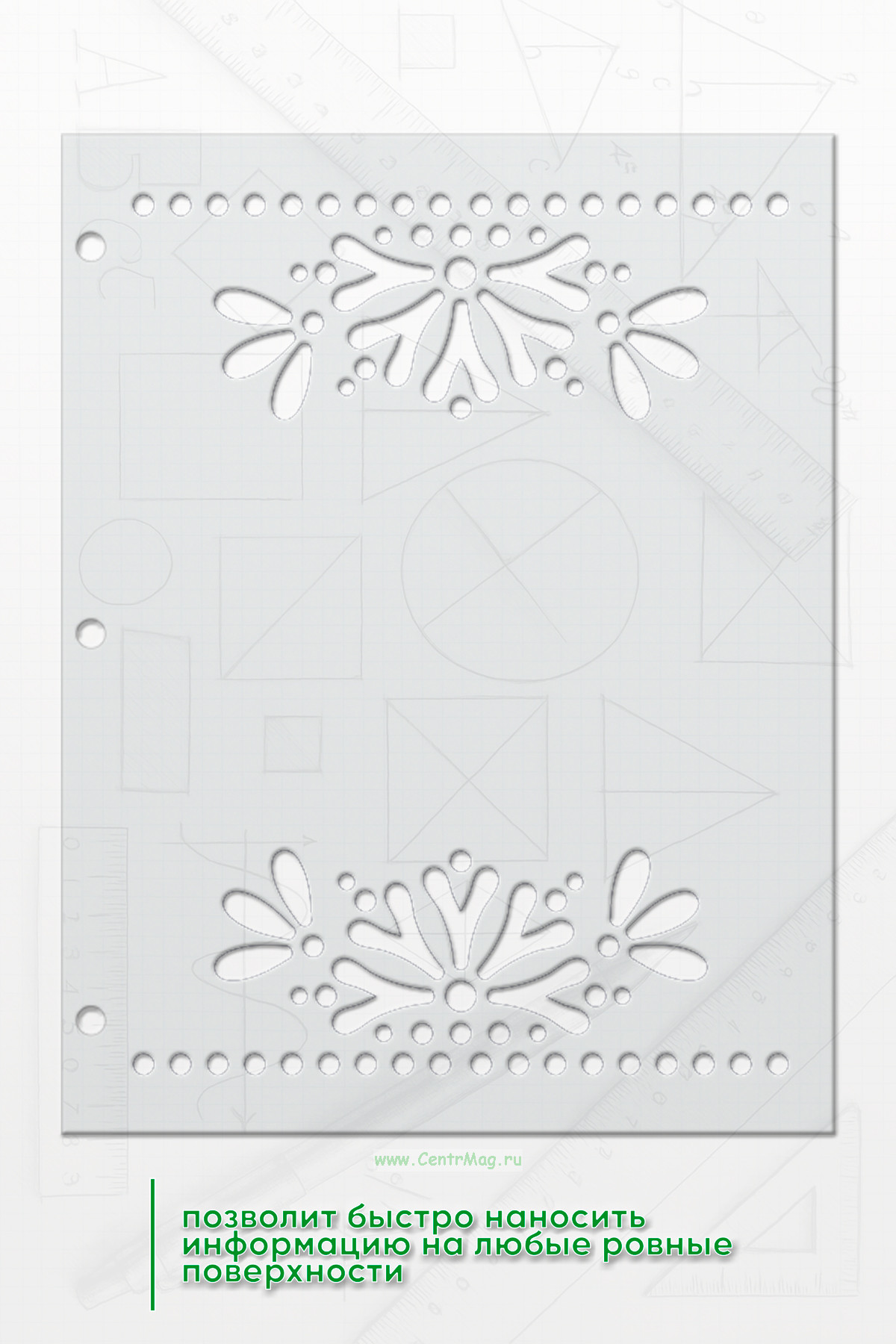 Трафарет позволит быстро наносить информацию на любые ровные поверхности. Прочный и упругий материал позволяет пользоваться трафаретом много раз.
