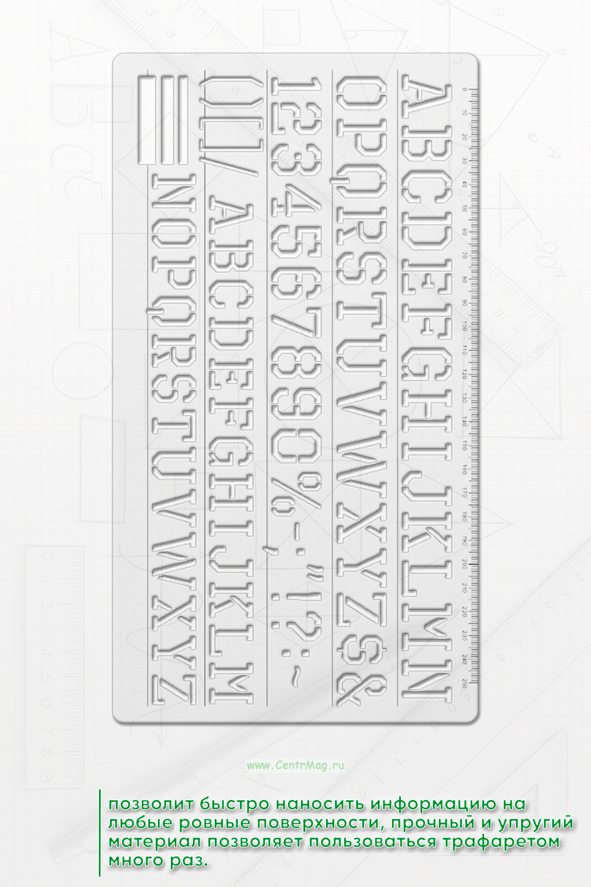 Линейка-трафарет "Шрифт Stenсil № 101" (англ. 282 х 154 мм) (280 руб.)