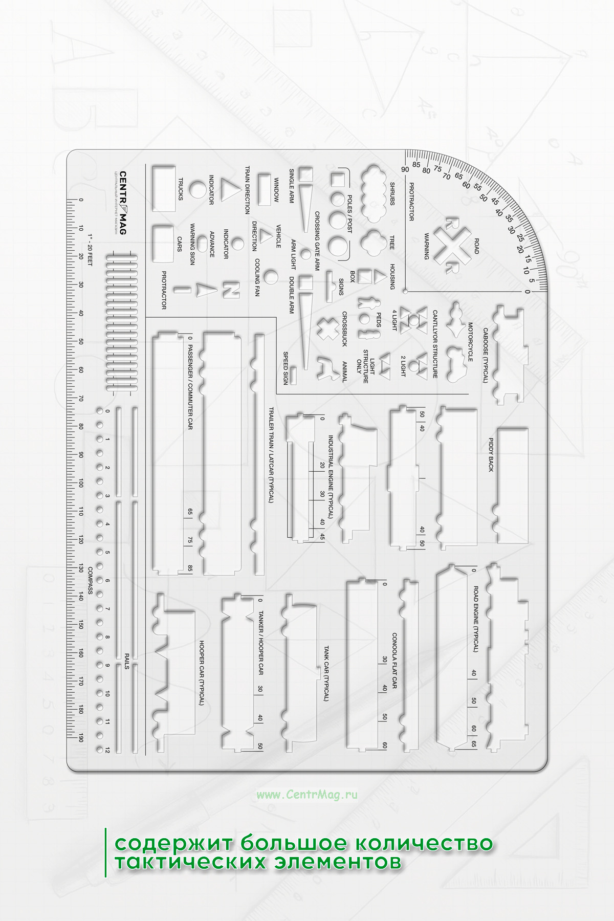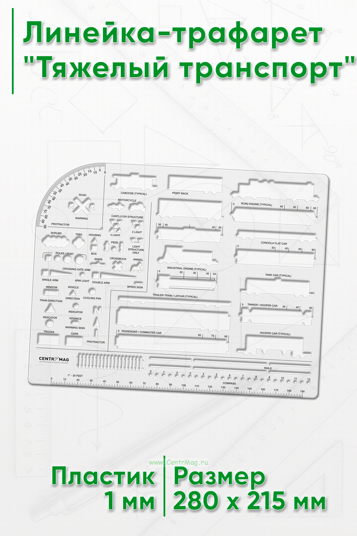 Линейка трафарет содержит большое количество тактических элементов. Очень удобна для выполнения чертежных работ.