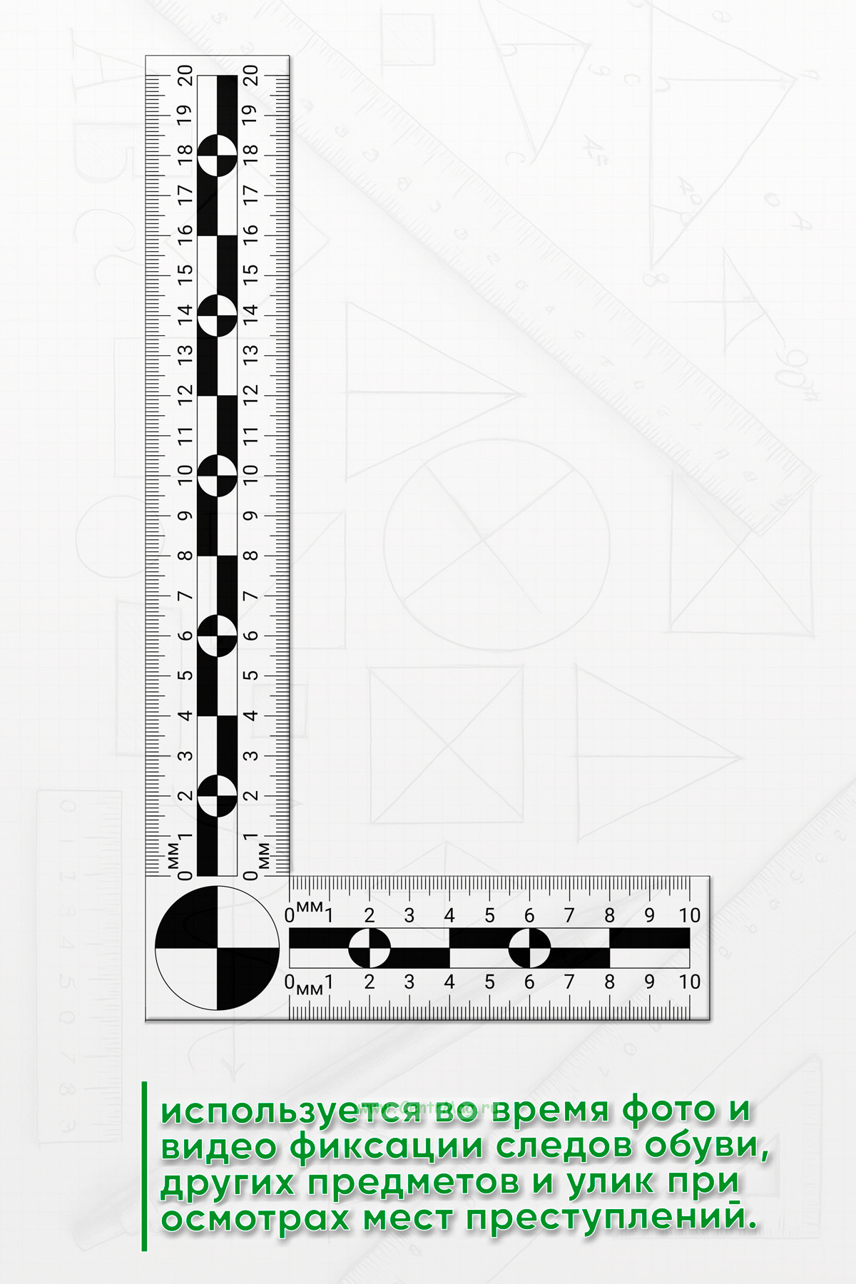Линейка угловая криминалистическая масштабная пластиковая линейка. Используется во время фото и видео фиксации следов обуви, других предметов и улик при осмотрах мест преступлений.