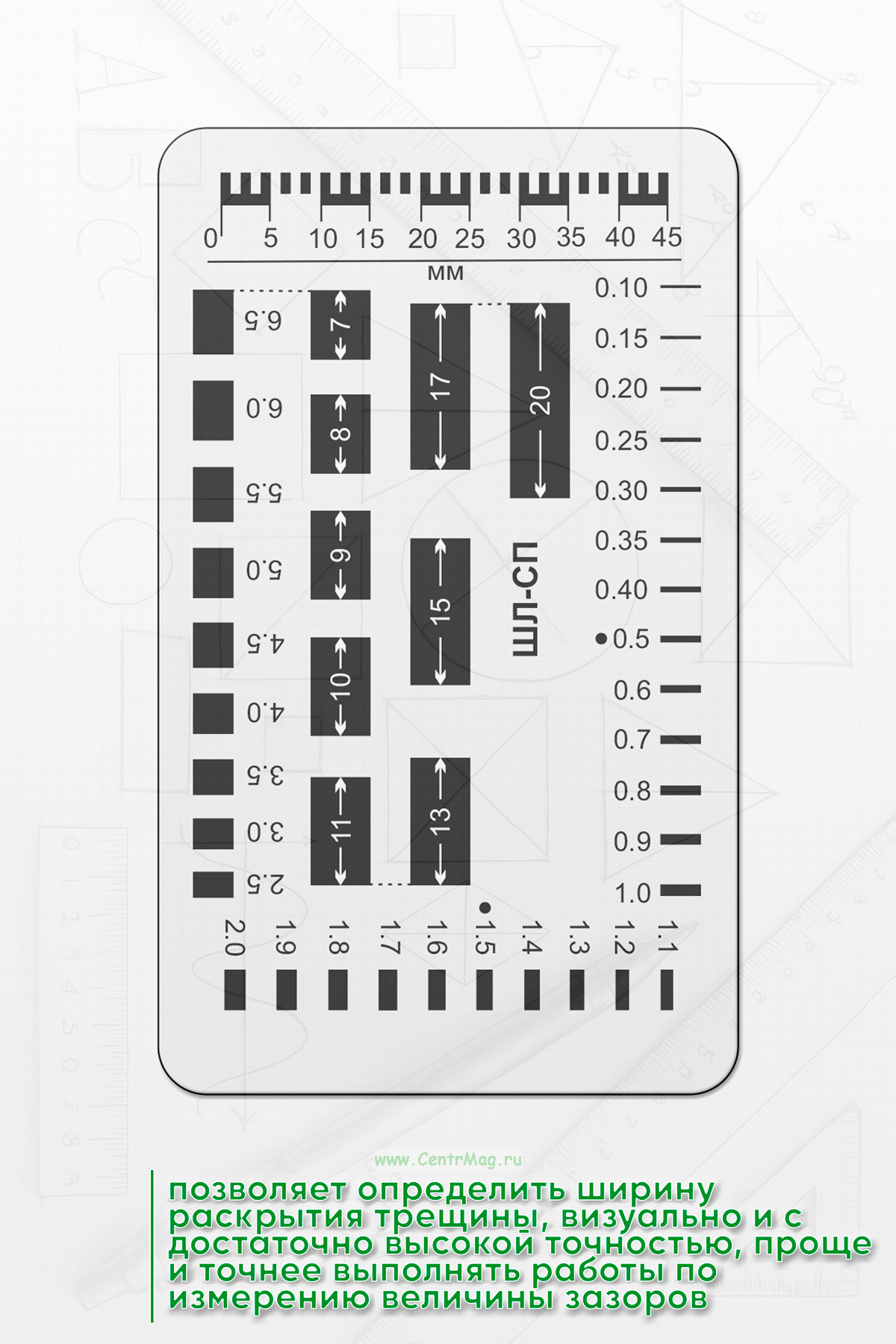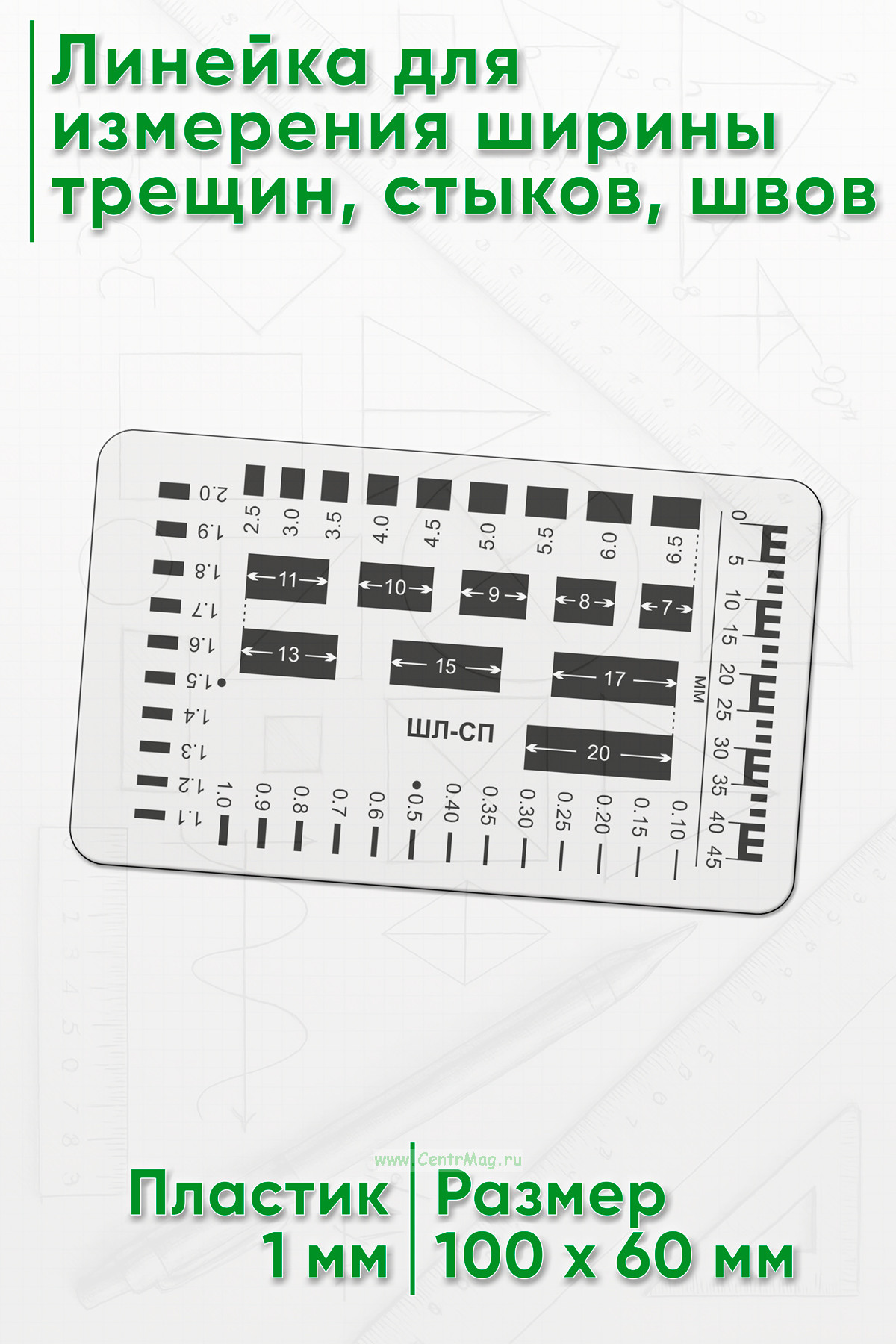 Линейка для измерения ширины протяженных элементов и повреждений: трещин, швов, стыков. Используется при контроле технического состояния зданий. Позволяет определить ширину раскрытия трещины, визуально и с достаточно высокой точностью, проще и точнее выполнять работы по измерению величины зазоров.