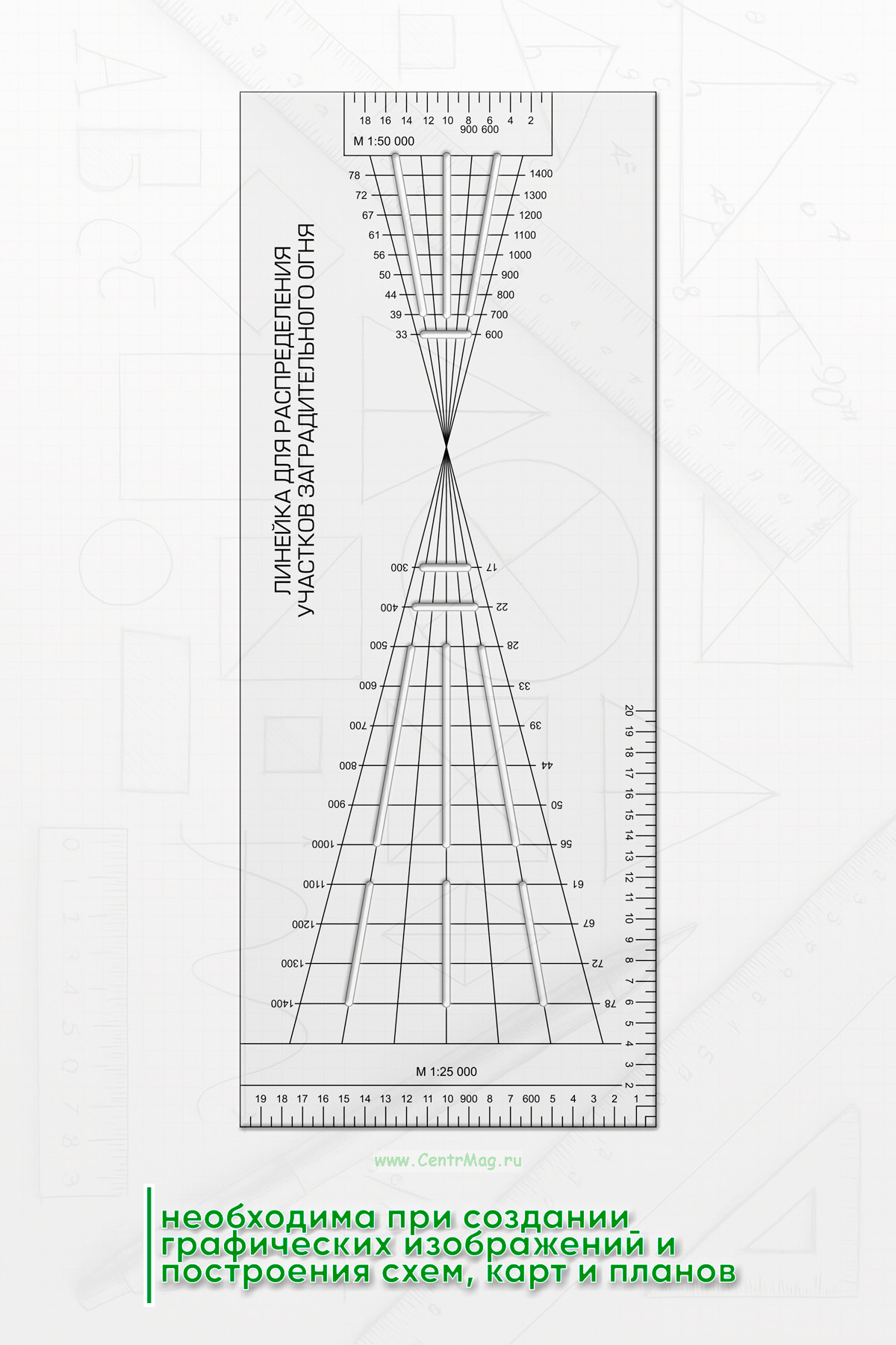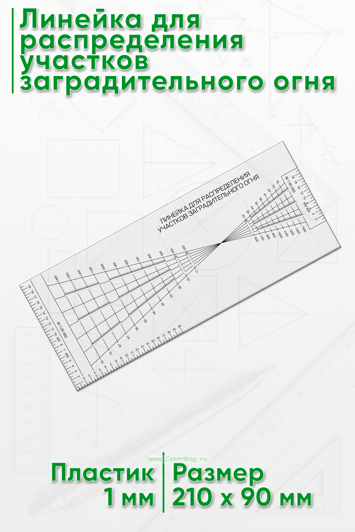 Линейка для распределения участков заградительного огня необходима при создании графических изображений и построения схем, карт и планов. Изготовлена из прозрачного пластика.