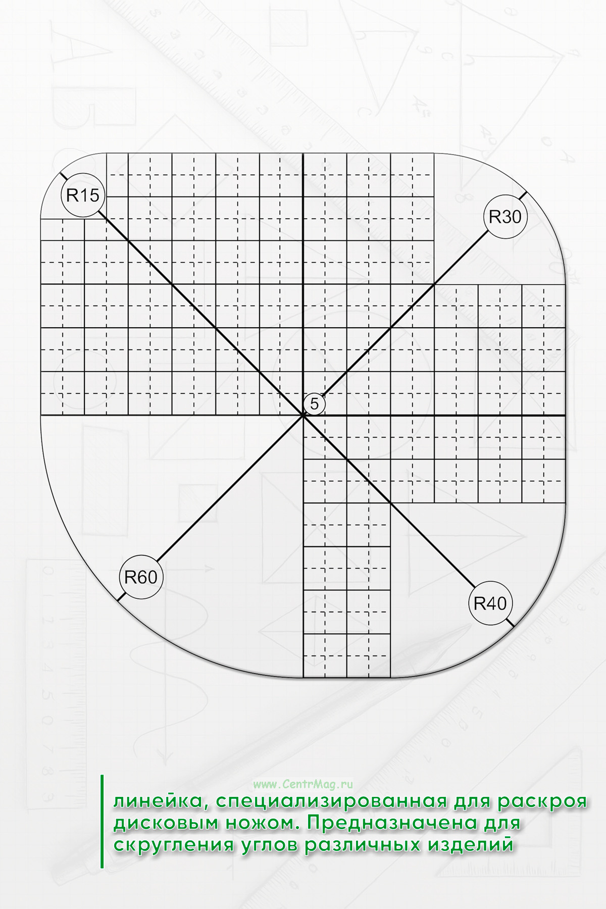 Линейка, специализированная для раскроя дисковым ножом. Предназначена для скругления углов различных изделий.