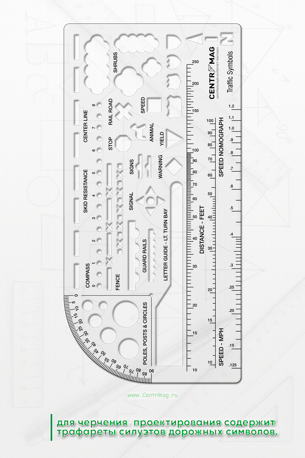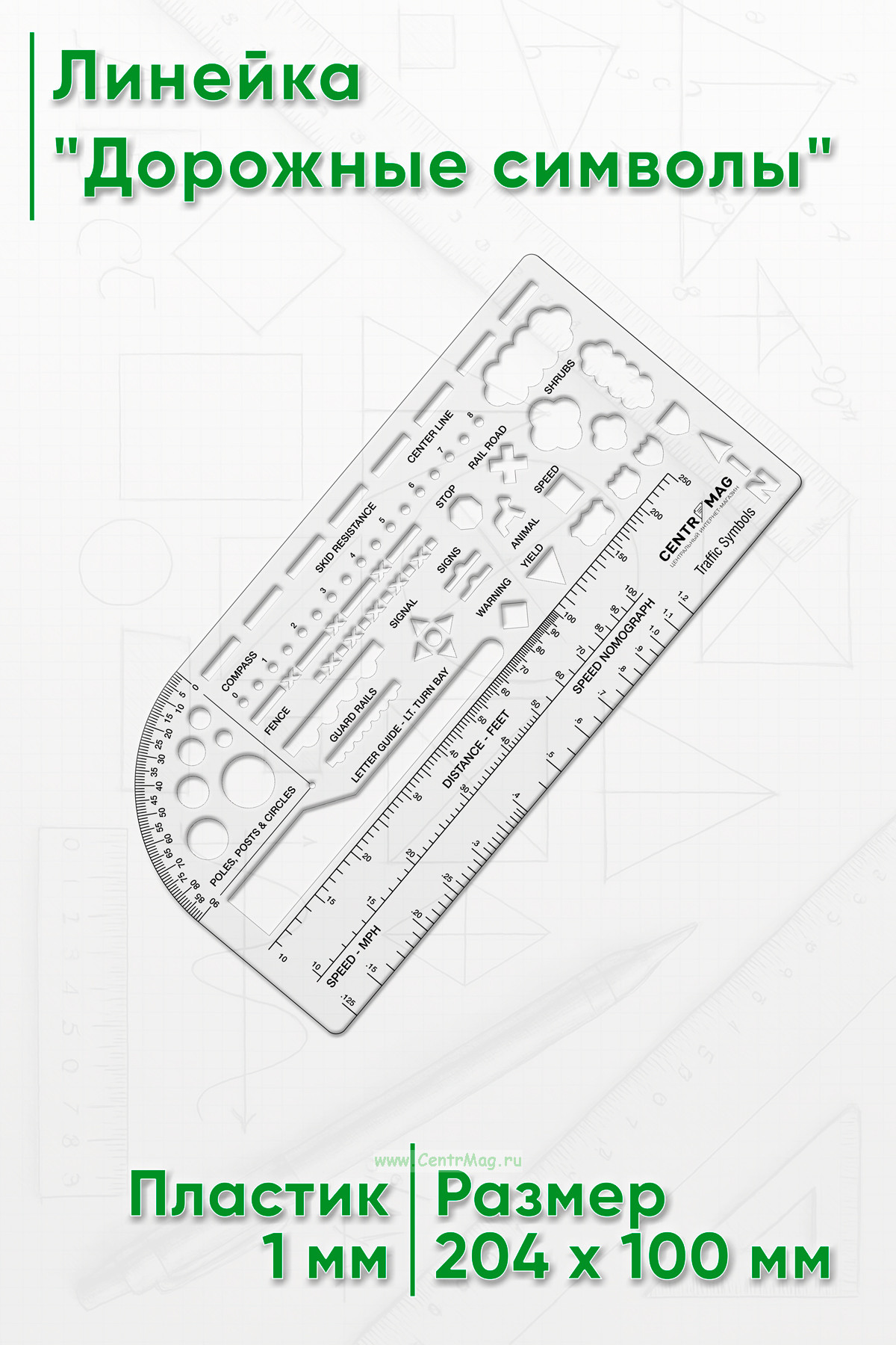 Шаблон для черчения/проектирования содержит трафареты силуэтов дорожных символов.