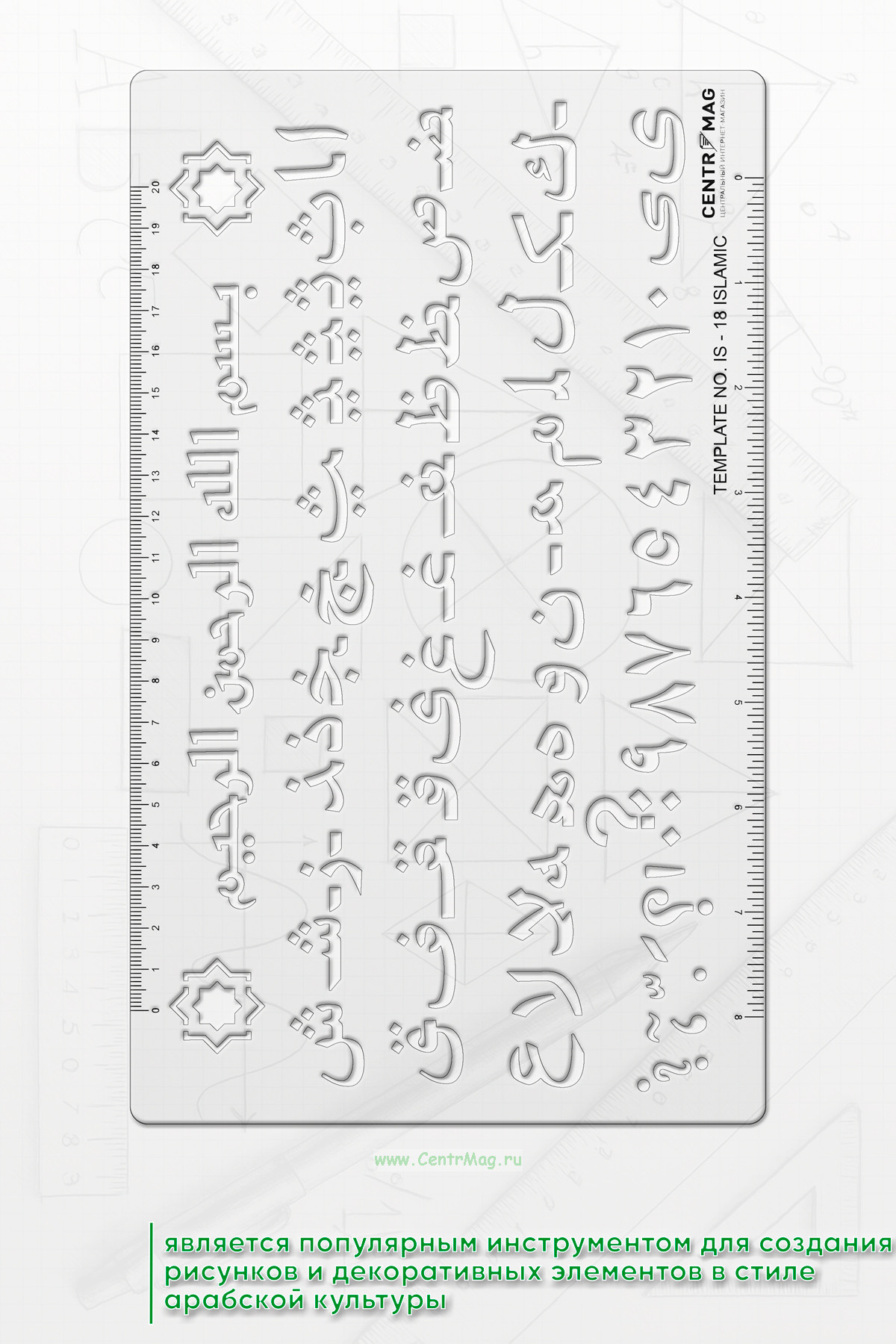 Линейка-трафарет с арабскими буквами является популярным инструментом для создания рисунков и декоративных элементов в стиле арабской культуры. С помощью трафарета можно легко и точно наносить арабские буквы на различные поверхности: бумага, ткань, стекло.