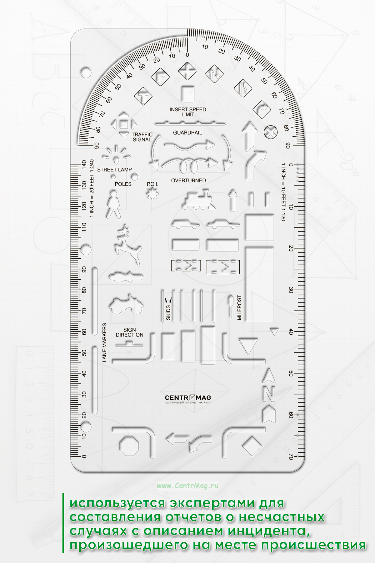 Линейка-трафарет используется экспертами для составления отчетов о несчастных случаях с описанием инцидента, произошедшего на месте происшествия. Обозначения на английском языке.