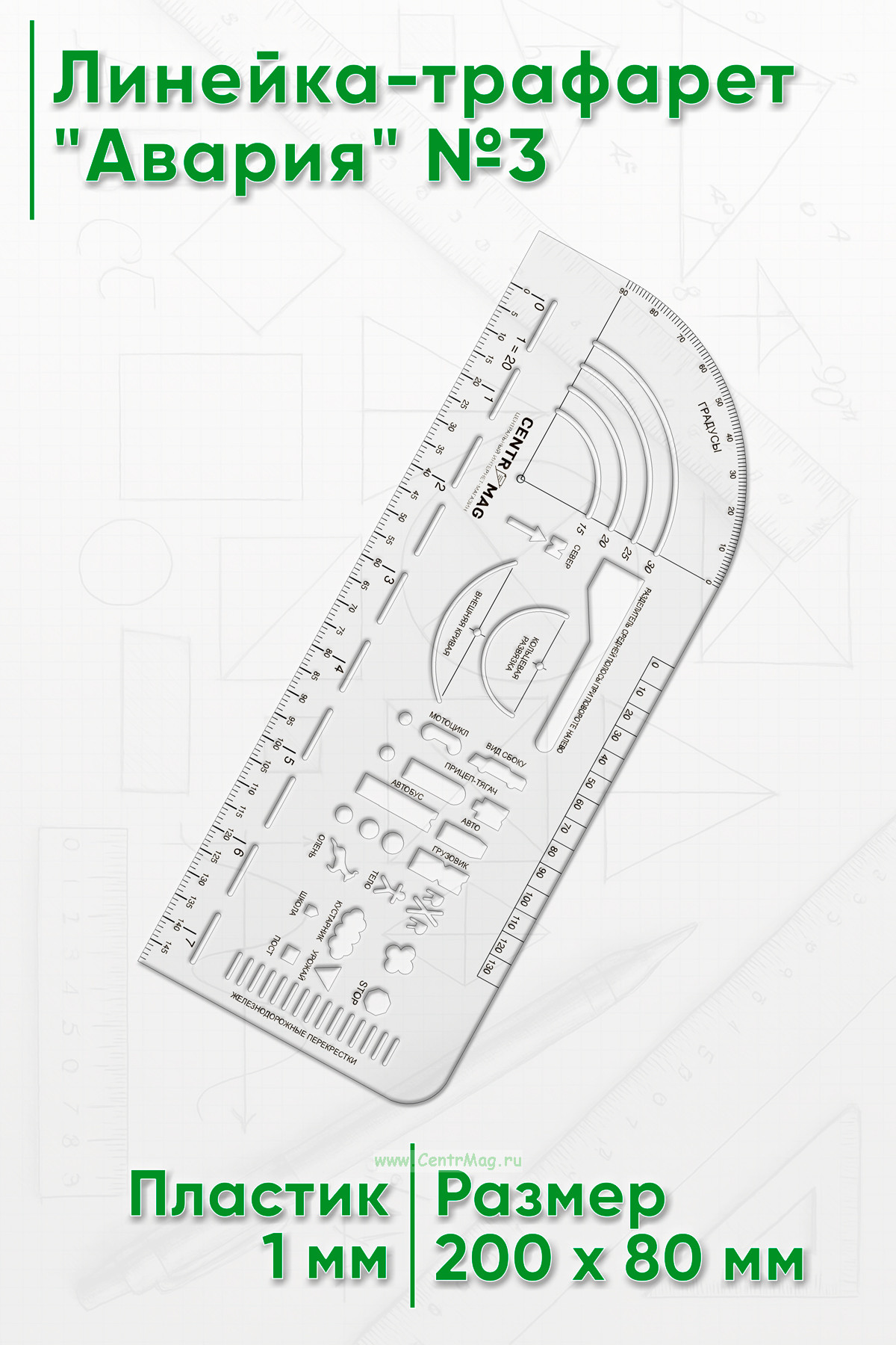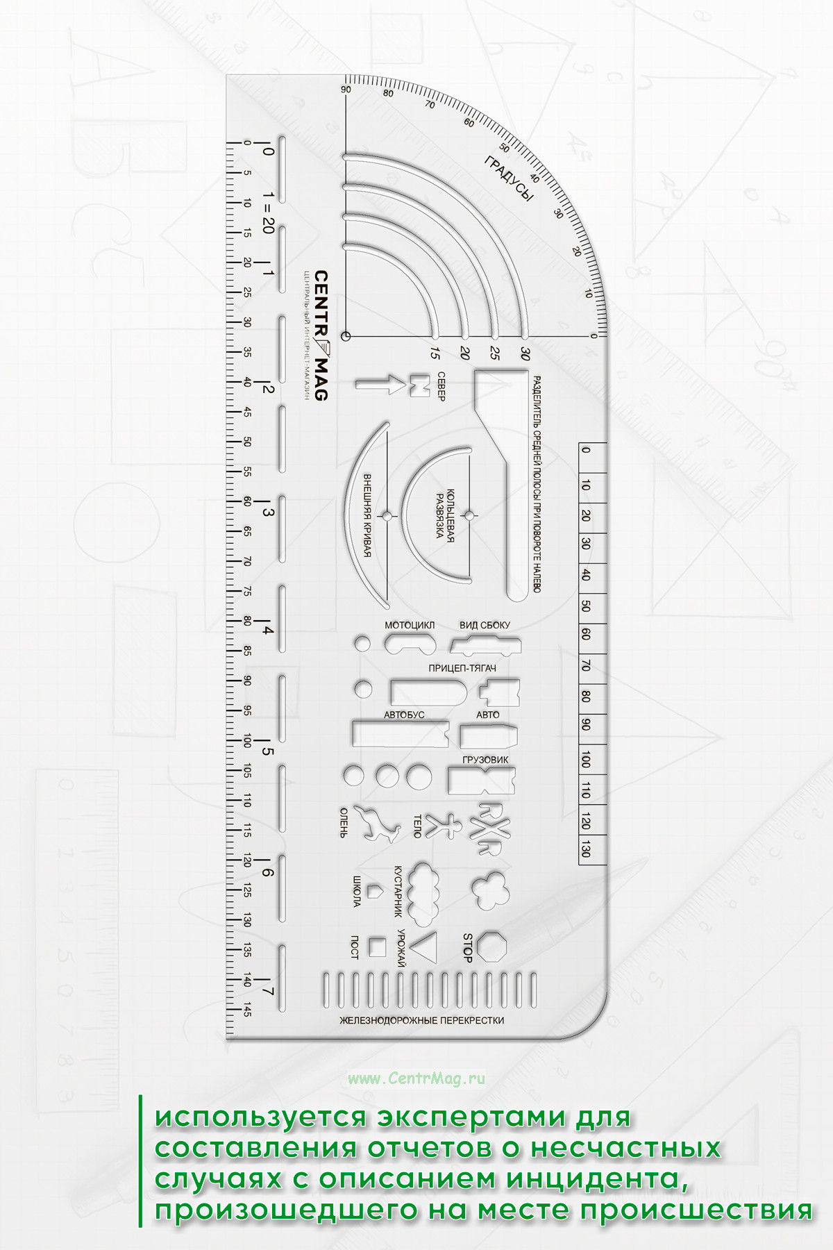Линейка-трафарет используется экспертами для составления отчетов о несчастных случаях с описанием инцидента, произошедшего на месте происшествия. Обозначения на русском языке.