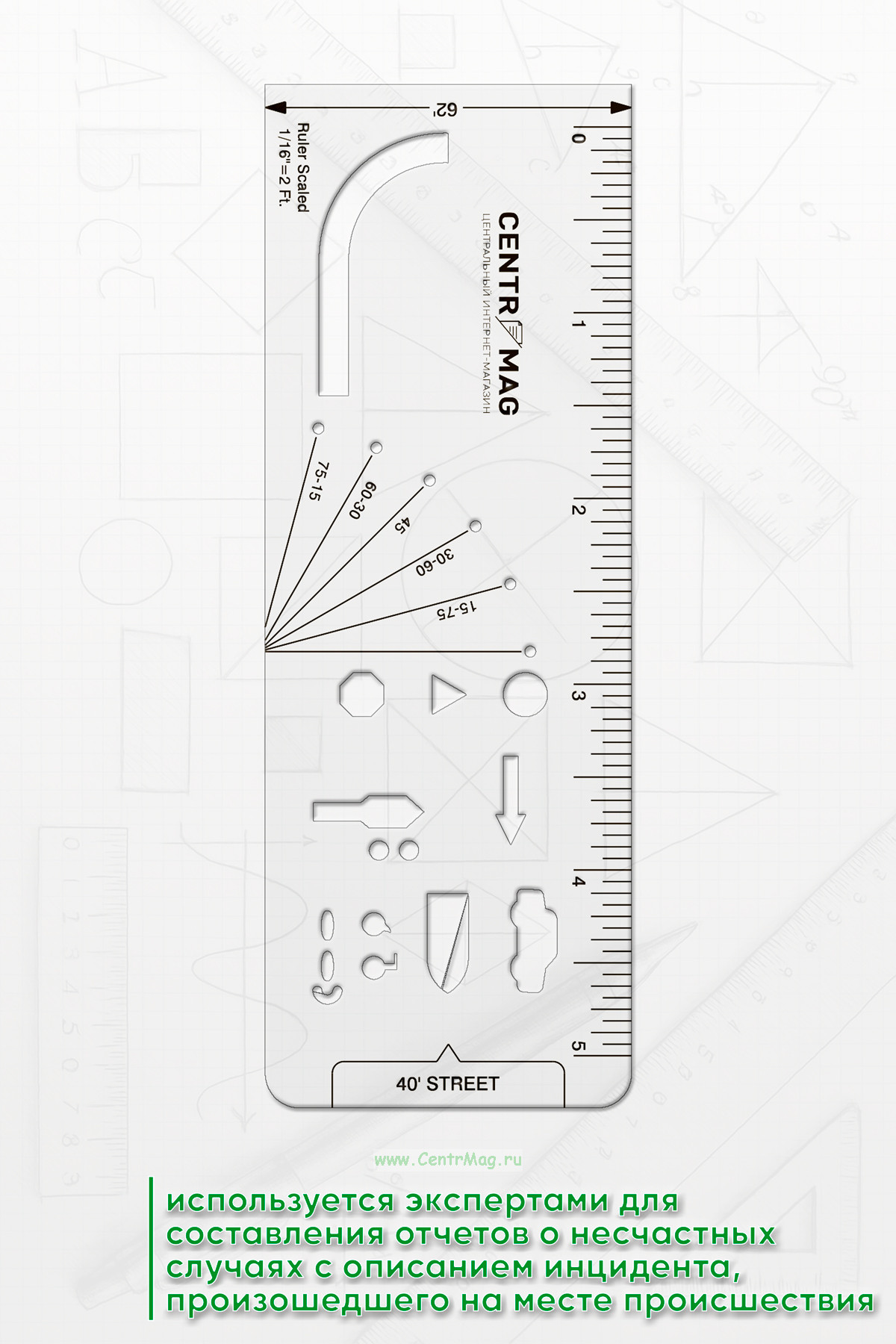 Линейка-трафарет используется экспертами для составления отчетов о несчастных случаях с описанием инцидента, произошедшего на месте происшествия. Обозначения на английском языке.