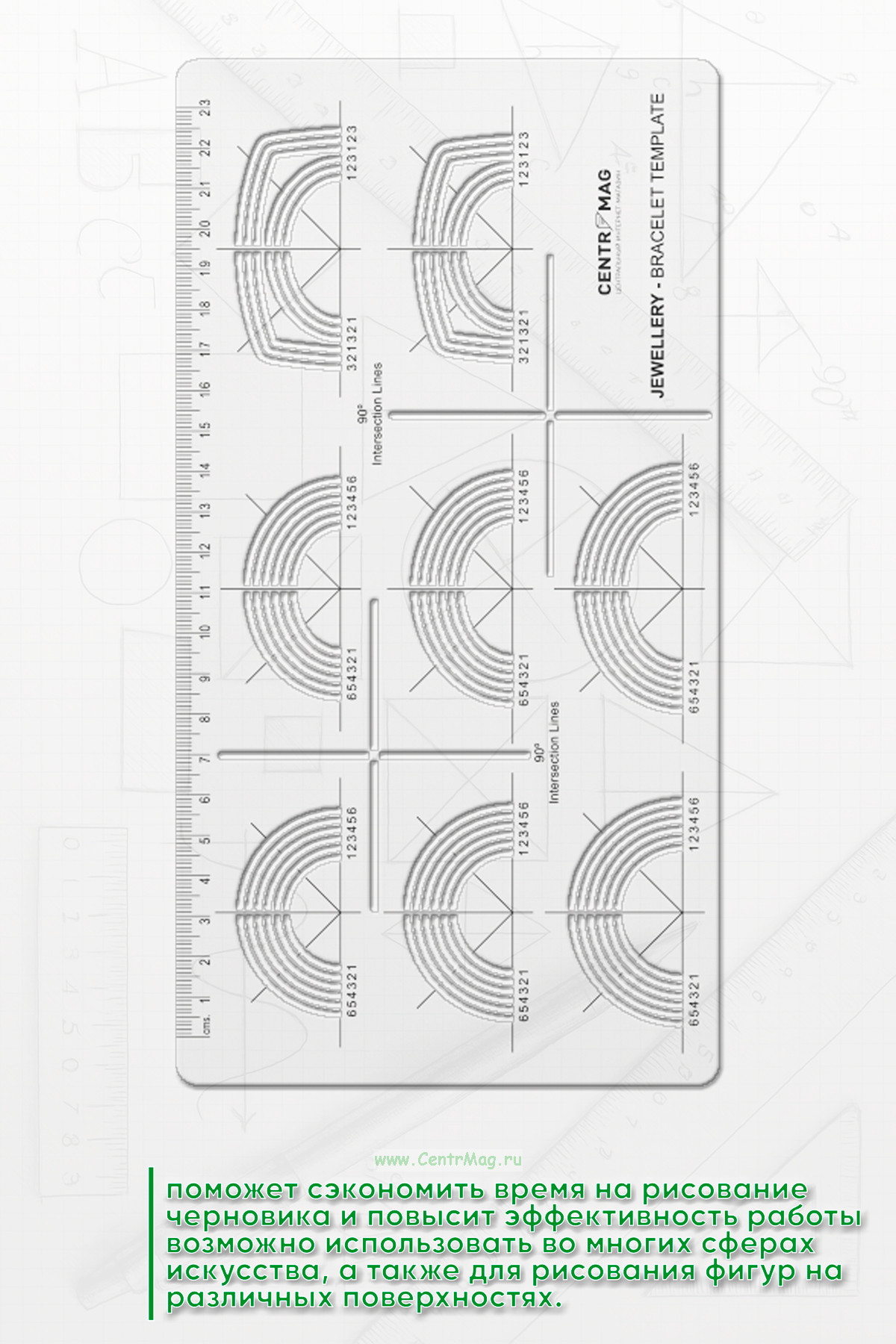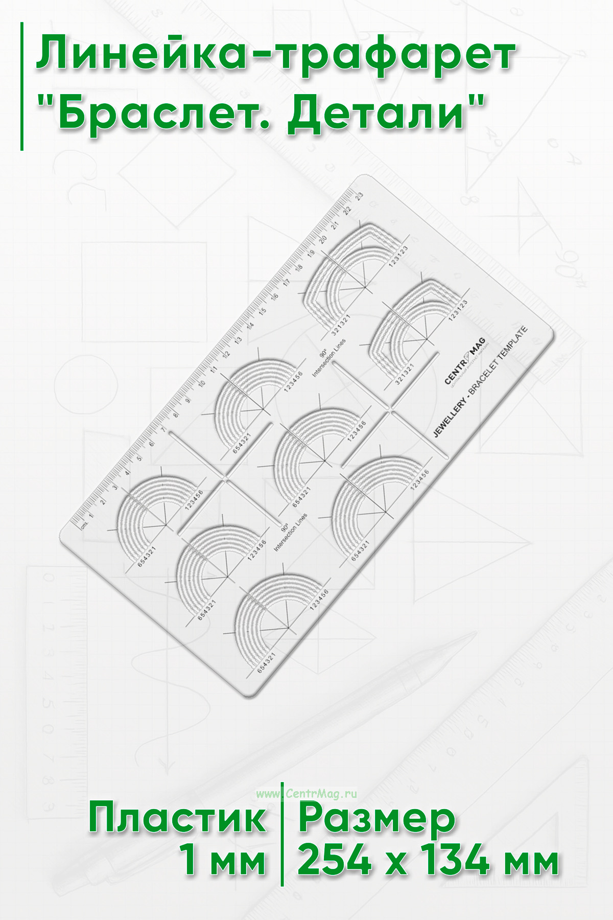 Линейка-трафарет содержит шаблон для дизайна браслета. Поможет сэкономить время на рисование черновика и повысит эффективность работы. Возможно использовать во многих сферах искусства, а также для рисования фигур на различных поверхностях.